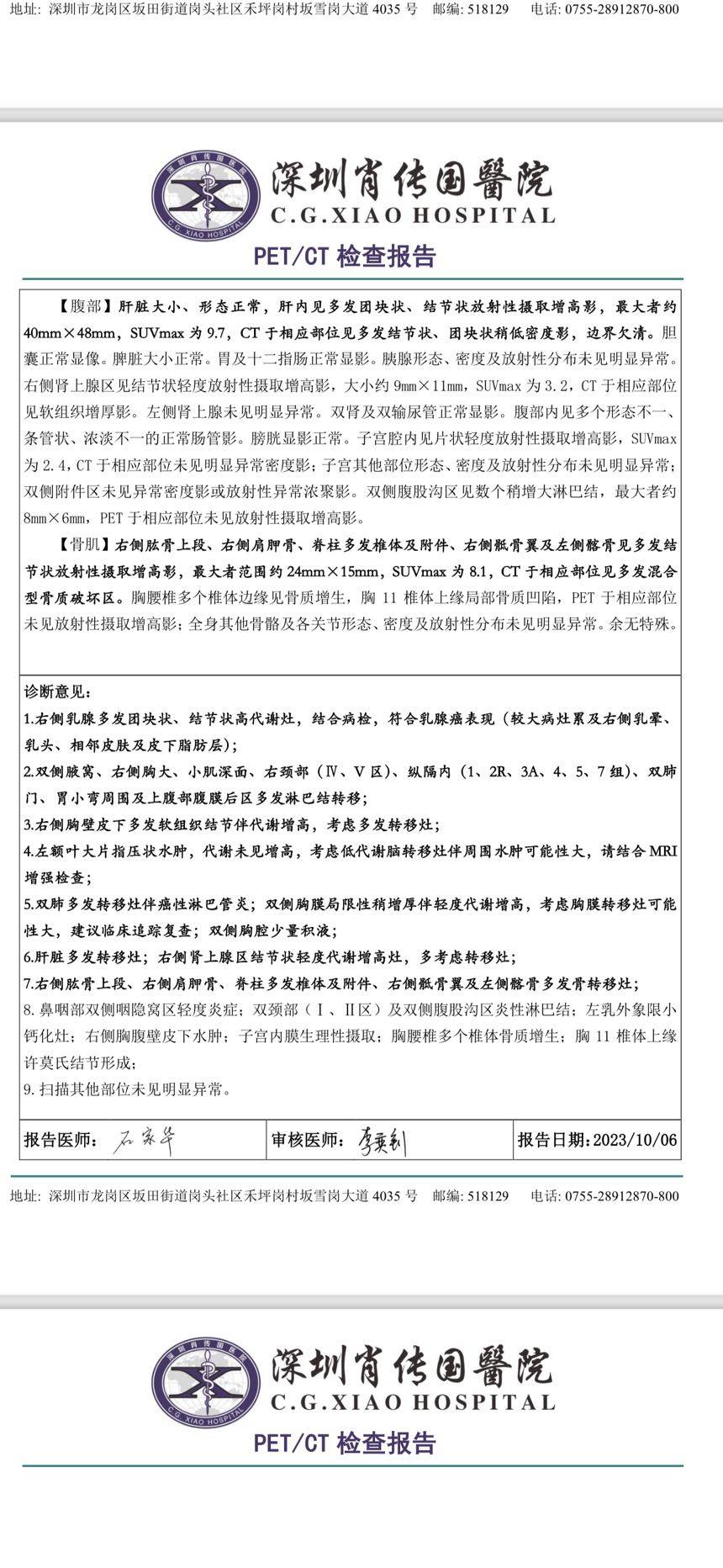 情况已经不能再糟糕了,乳腺癌晚期,肝、脑、肺、骨、淋巴都有转移。我在各个平台上查询,都没看到比这更糟的了。但是母亲既然决定西医治疗,那我又怎么可能放弃这最后一丝希望。于是第二天就去了广州准备住院。