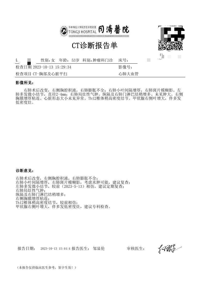 所以今天拍了ct的同时,也挂了专家号,拍完后立即去了诊室,等了一个小时,终于轮到我们了,然后专家在电脑上看了刚刚拍的ct,我简单描述了手术前后的情况,他说有胸腔积液,会慢慢吸收,我又让他看了妈妈的伤口,他说恢复的不错。说3个月后再复查,继续吃靶向药,按照华西的治疗方案进行,反正几句话把我给打发了,我想,应该没啥事吧。回到家已经6点多,发现报告已经出来了,以往都需要两三天,今天的报告居然这么快。看了下报告,主要是有胸水,以及右肺膨胀不全,可能是胸水导致的膨胀不全?