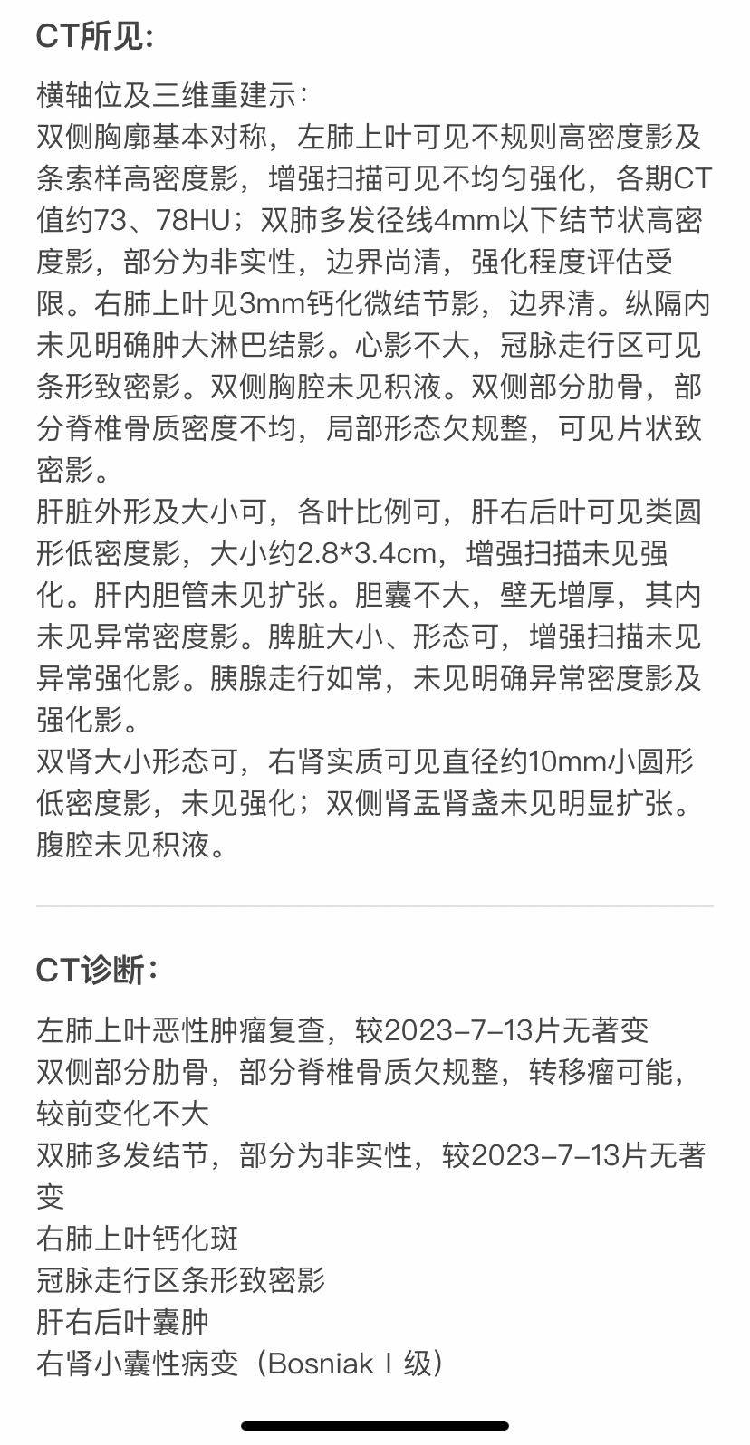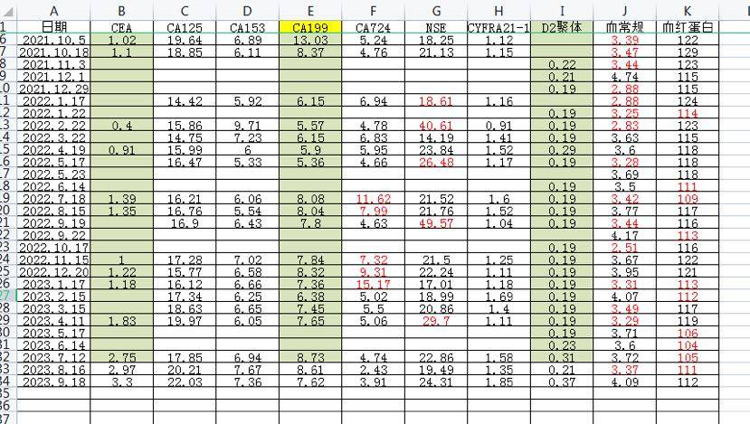 妈妈肺腺癌晚期,多处骨转,19突变,一线奥希25个月。继七月份复查是肺部原发稍增大,大胆的观察了两个月,九月份再次CT,跟七月份对比又是无明显变化,看到报告的那一刻总算喘了一口气。妈妈得CEA不敏感,但是从数据对比看,我感觉还是缓慢耐药了,我把从确诊到现在的数据整个研究了一遍,发现无论从CEA还是D2聚体感觉肿瘤细胞应该是蠢蠢欲动了。妈妈CEA虽然还在正常值,但是确诊两年来,第一次达到了三点多,还有那个稳定了好久的D2聚体也达到了确诊时的数值,加上CT值也一次比一次高了(下面附数据图)。虽然医生不在意这些,认为都在正常范围就是稳定,但是我感觉八成缓慢耐药了。