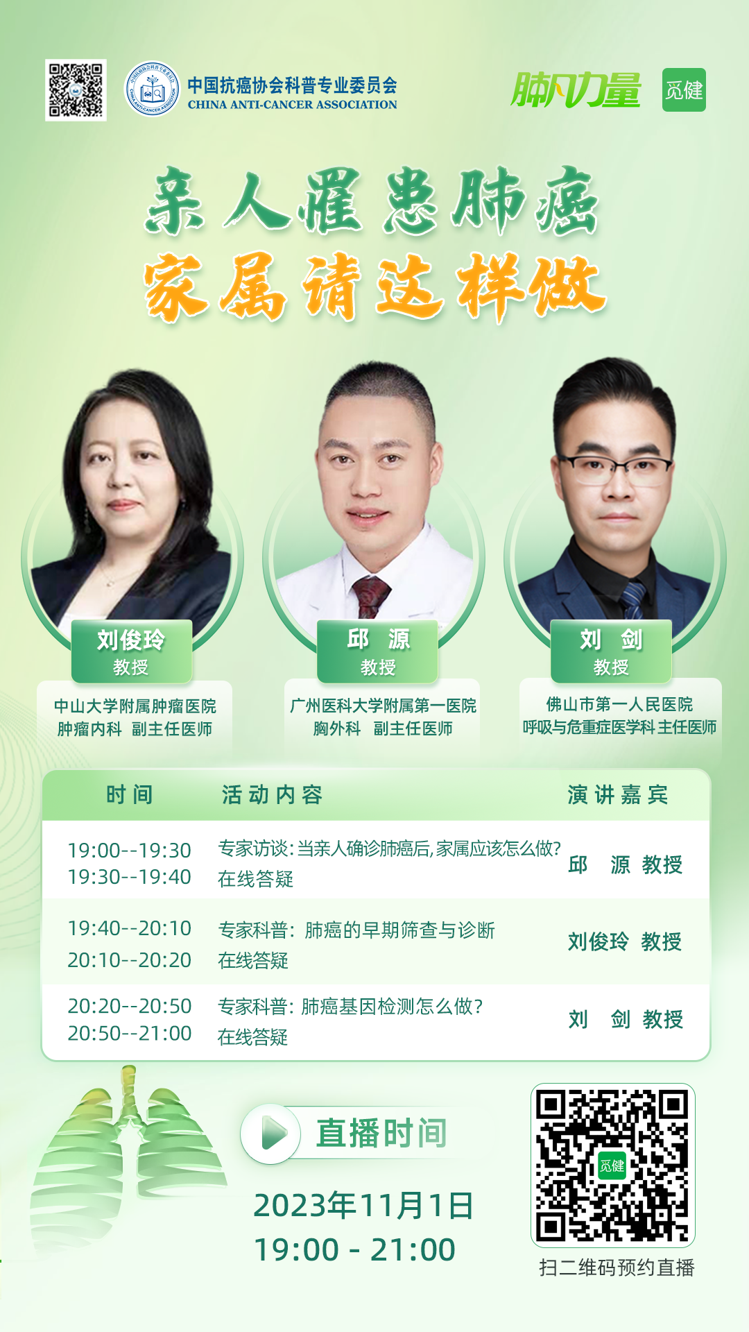 来自广州医科大学附属第一医院胸外科的邱源教授 来自中山大学附属肿瘤医院肿瘤内科的刘俊玲教授 来自佛山市第一人民医院呼吸与危重症医学科的刘剑教授