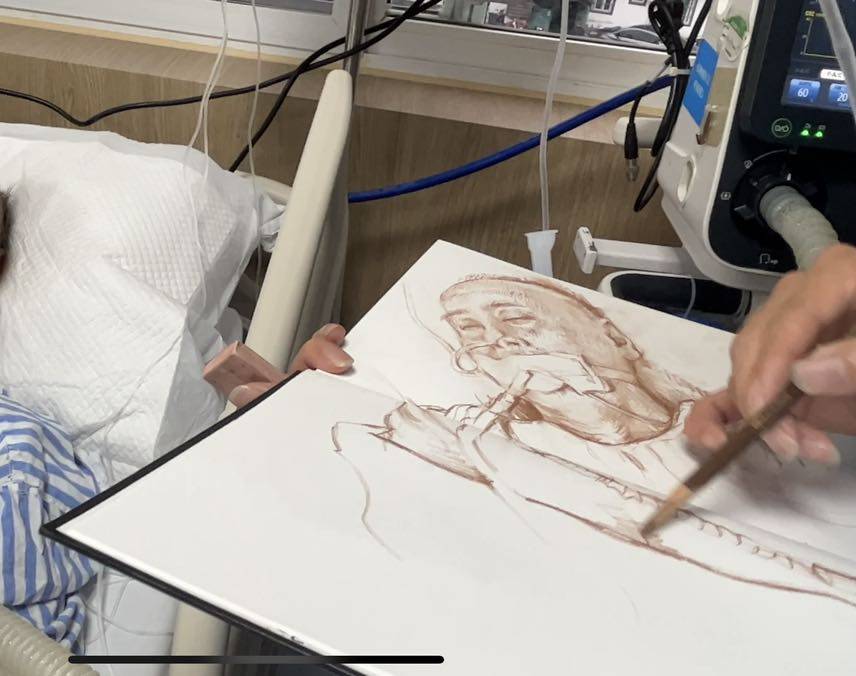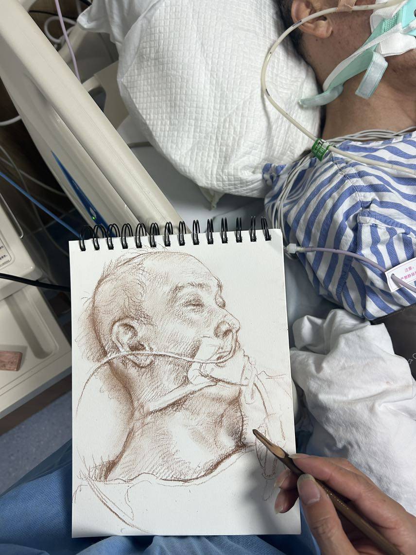 我和母亲每天下午过去探视,杭州肿瘤医院在人性关怀上还是比较周到,探视时间可以轮番进去。面对睡着了的父亲,我们对着他耳朵说话,我知道他也许听的见,我还在病床边给他画了两次肖像,默默地为他祈祷。