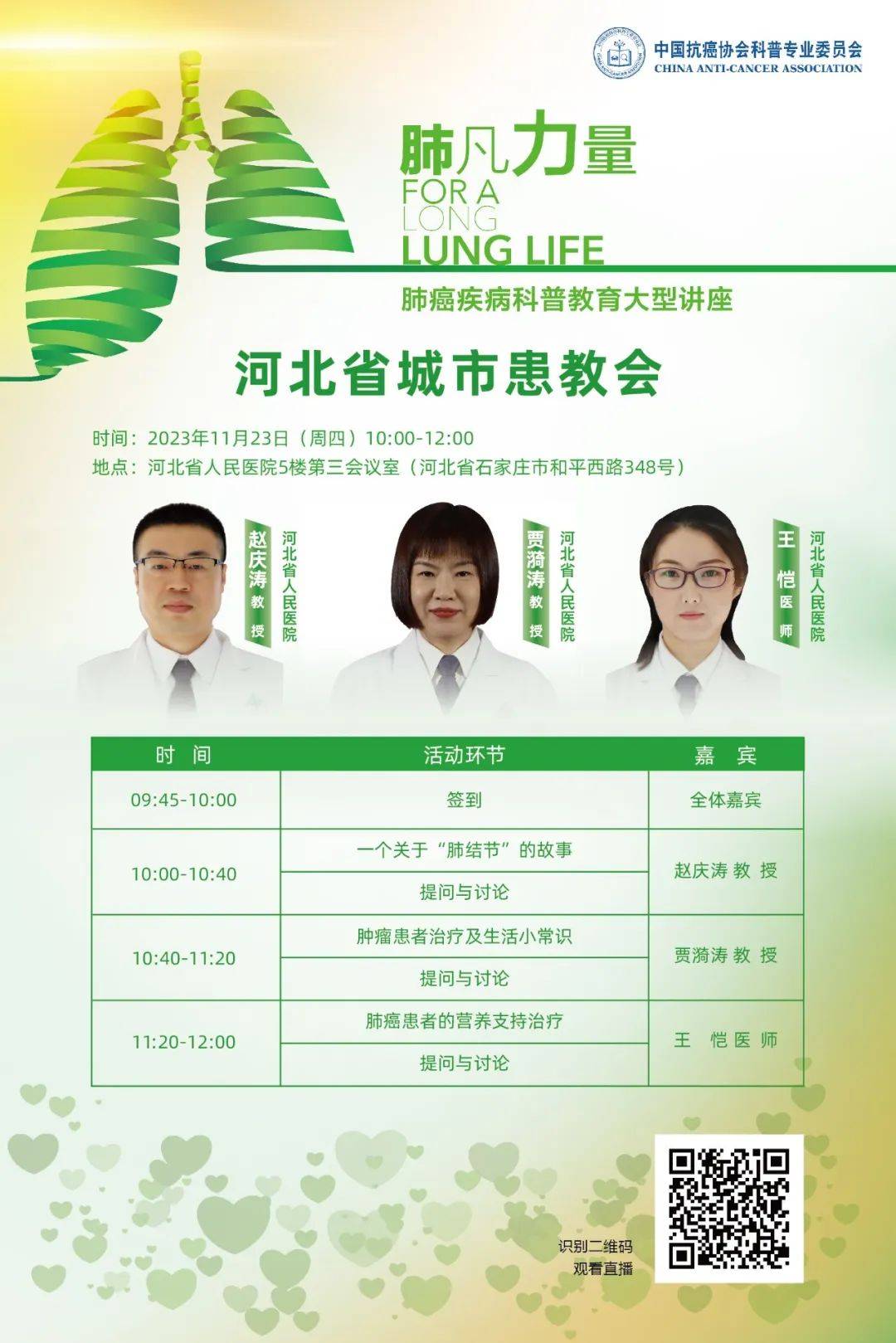 10:00-12:00期间,河北省人民医院还将举办患教科普活动,患者及家属可以更系统、全面了解肺癌癌种的诊疗方式,以及对肺癌患者的规范护理,学习更多关于肺癌疾病的知识点。