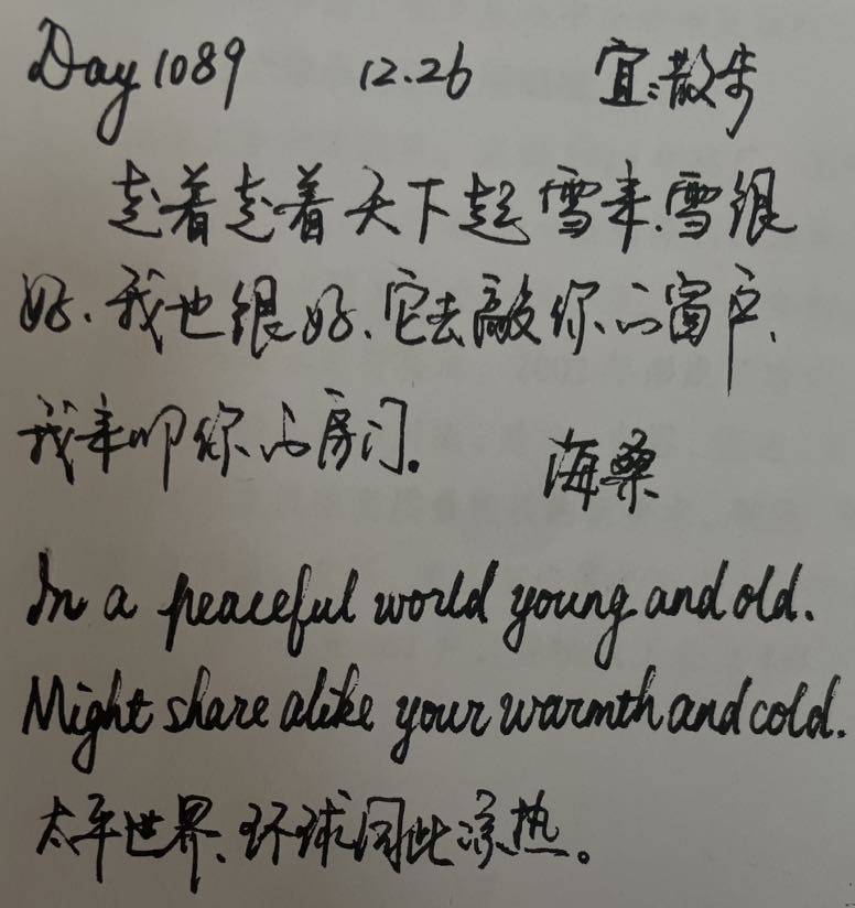 字写得真好看!走着走着天下起了雪,雪很好,我也很好,它去敲你的窗户,我来敲你的房门。