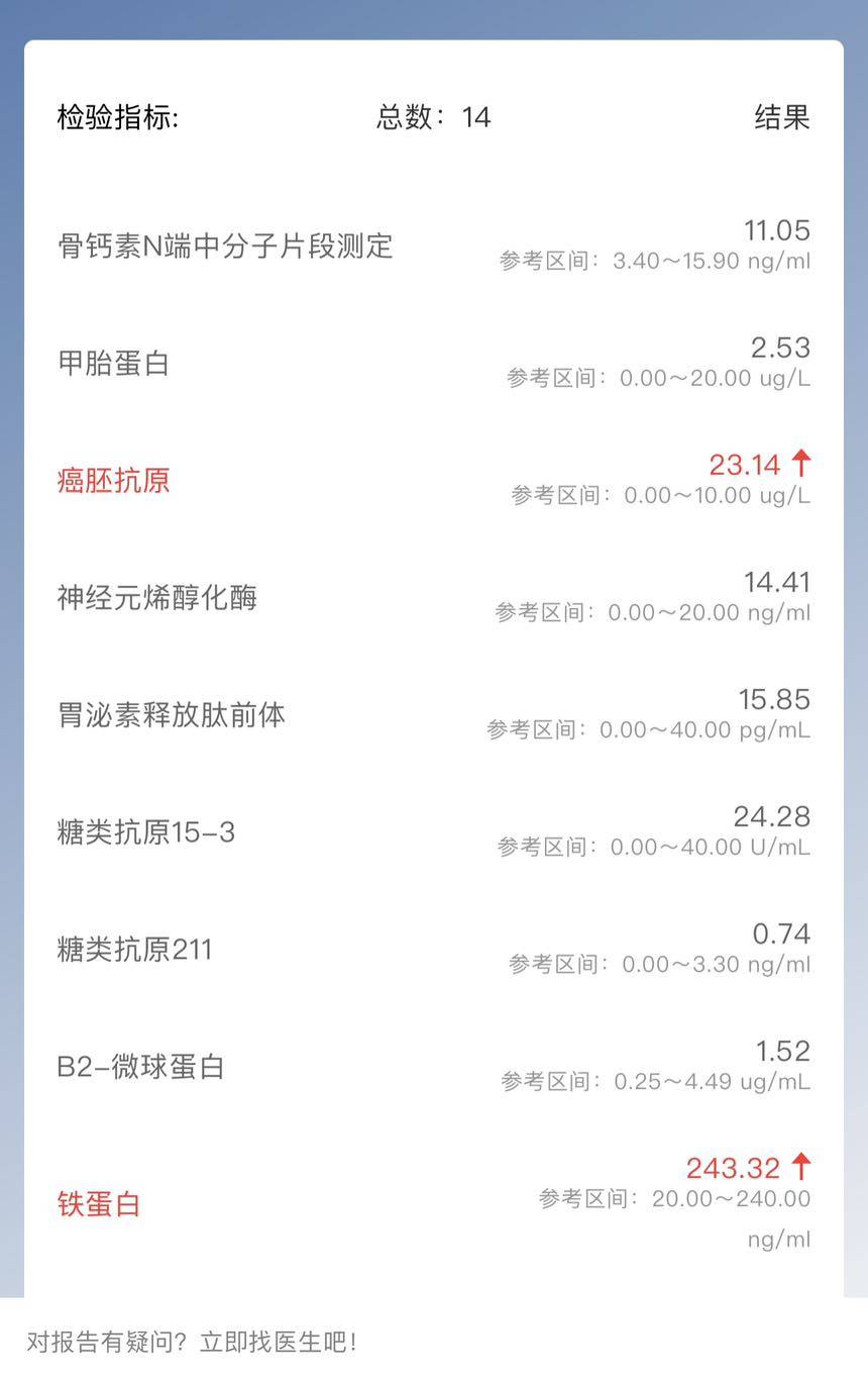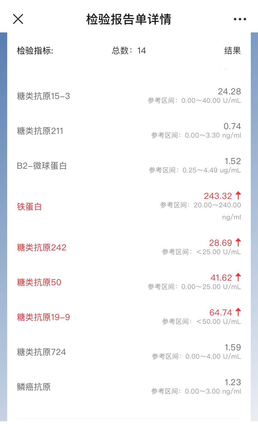 1/18入院今天终于出院了,这次复查结果非常不理想!颈部淋巴肿大翻倍了,癌胚抗原也上升很多,心里真的很难受!这次通过和医生沟通才突然知道我老公的肺腺癌是伴肠化,其实对化疗并不敏感,但是不管怎么样他去年一年还是比较稳定的了,没想到开年就给我重重的一击!其实去年一开始确诊我就知道他是伴肠化,但是当时医生没有说他这个属于罕见类型,所以我以为并不严重!上个月由于换药白紫无效也耽误了一个月的时间!现在医生用了伊立替康,这个化疗药物是针对肠癌的,但愿有效果吧这个方案也是肺科医院的教授周彩存定的方案。如果大咖定的方案还是无效,那就真的只能接受死亡了?周三约了放疗医生,接下来看看是不是可以改变一点,阿弥陀佛保佑🙏愿大家都能顺顺利利!