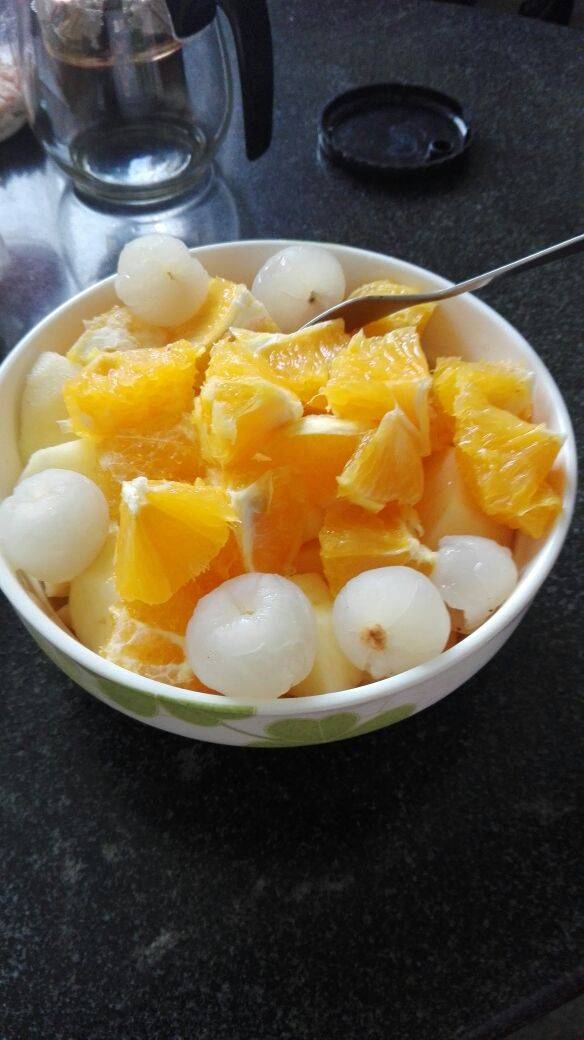 水果早餐。累了饿了都想吃水果。没有西瓜,苹果两个,橙子两个,荔枝七个。