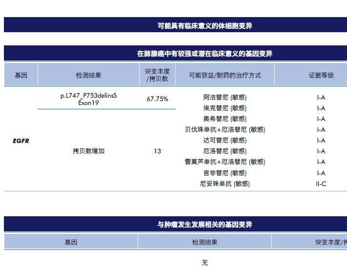 基因检测:EGFR阳性 19 del,P. L 747 _P753.S