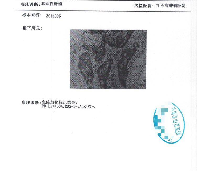 病理:肺腺CA,PD -L 1 >50%,中-低分化,免疫组化 ALK( -)