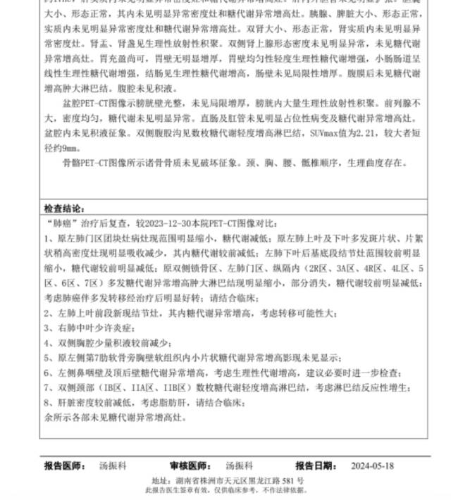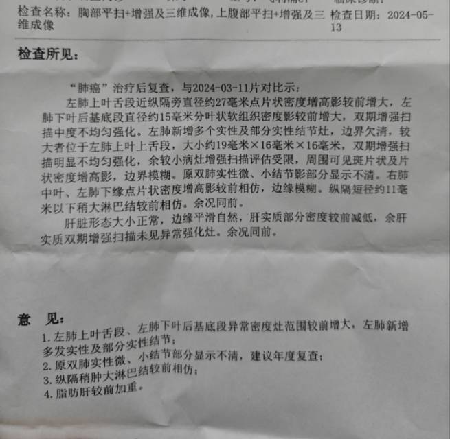 我老公2023年12月28日确诊肺腺癌t3n3m0期,听到消息的我瞬间石化了,我们还有很多的好日子、可爱的儿子和很长的路要走的呀,通过一个元旦假期的煎熬,基因检测结果出来了,alk突变,我当时真的是欣喜若狂,觉得是不幸中的万幸,于是2024年1月8日开始服用阿来替尼,期间体感很好,咳嗽症状一周几乎完全消失,3月11日复查接近左上肺7cm的病灶缩小到10mm,主治大夫杨农医生说效果非常好,长生存肯定没问题,两个月后来到了5月13日第二次复查,也是服用阿来的第四个月,以为能彻底cr的我拿到报告的那一刻从天堂掉到了地狱,原发灶增大,新增病灶接近2cm,那种心情比确诊时还要绝望,作为alk才服药4个月呀,真的不能接受,杨医生看到影像也呆住了,说这么快不符合肿瘤的发展规律,马上安排了住院,做穿刺确定病理,我一直祈祷是个感染,但是我在病理室跑了无数趟,医生很遗憾的告诉我初步可以确定是恶性的,仅存的一点侥幸也没了,我马上给他安排了pet➕脑核磁➕基因检测,pet结果显示还是在左肺内,免疫组化和基因检测没有出来,各位大神们,我家这种情况接下来的路该怎么走?有人说可以赌免疫,毕竟高表达,有人说还有洛拉