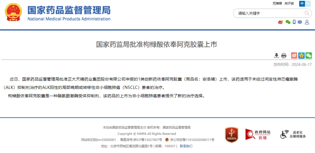 图片来源:NMPA官网截图的依奉阿克获批报道