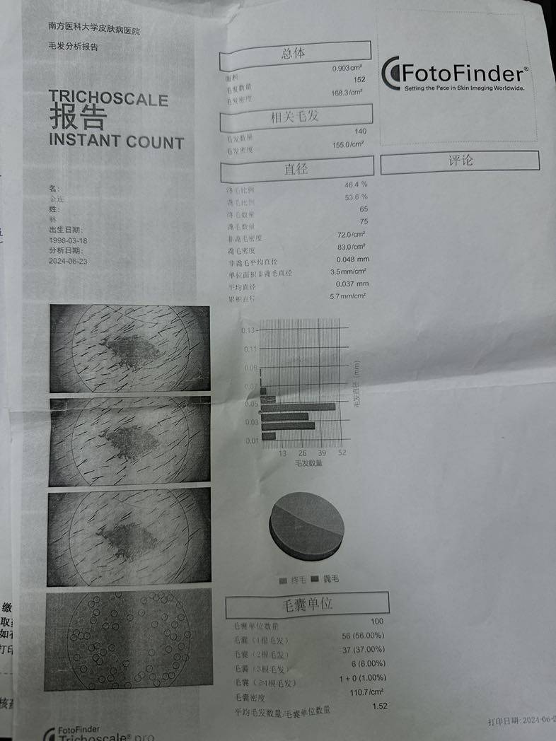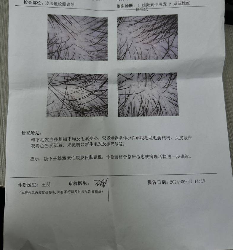 昨天去了皮肤医院看了,针对头发看的。医生说有可能不是狼疮发导致,因为狼疮脱发不是这样掉的。然后给我开了检查,做了毛囊检测。然后医生说红光治疗一下吧,我心里想了一下,七八年了,都没长出来头发,那就再相信一次,之前从未这样治疗过,先试一下看看吧,虽然费用有点贵,没办法了。昨天就花了3000左右了,加上做检测的300左右,4次的治疗2500左右,做一疗程12次,费用8000左右这样吧。再加上其他估计上万了,随便吧,只要有效果,钱多点没事。