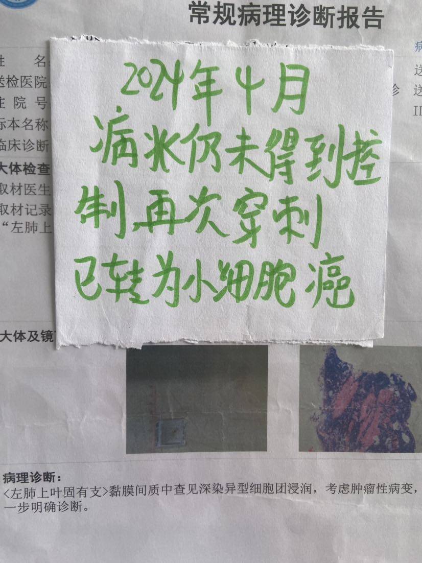 ☑️24年4月底复查,病兆还是未得到控制,再次穿刺,已转为小细胞肺癌。
