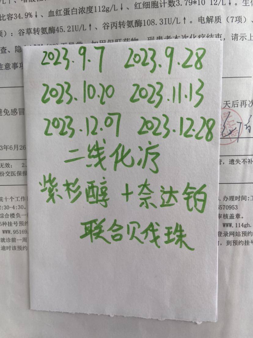☑️23年9月—12月期间:再次开始化疗,用药为「紫杉醇➕奈达铂」,11月开始联合贝伐珠单抗