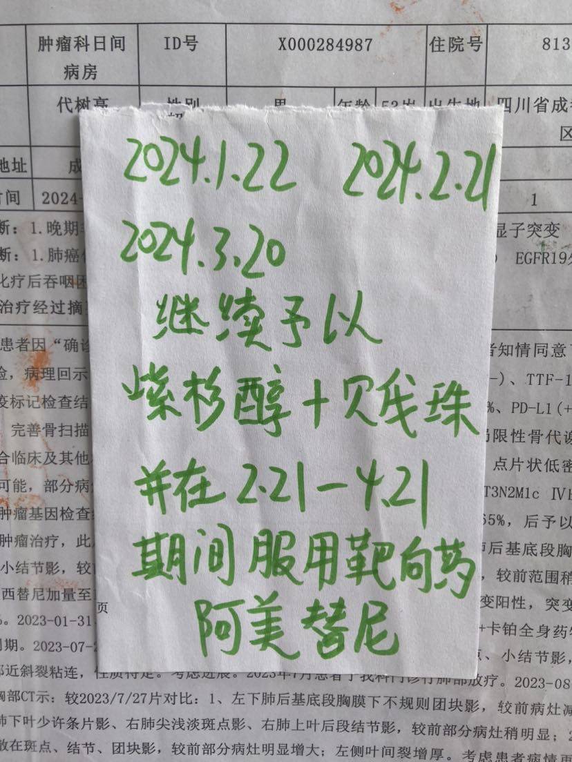 大致说一下我爸的情况,21年5月确诊肺腺癌晚期(骨转移)。同年7月开始服用靶向药「奥西替尼」,同时每月一直在打保护骨头的针药「地舒单抗」。这期间他身体一直很好,药几乎没什么副作用,状态也很好,每天还会出去打麻将。但吃了将近一年半以后,22年12月发现病兆进展,23年1月开始入院化疗。