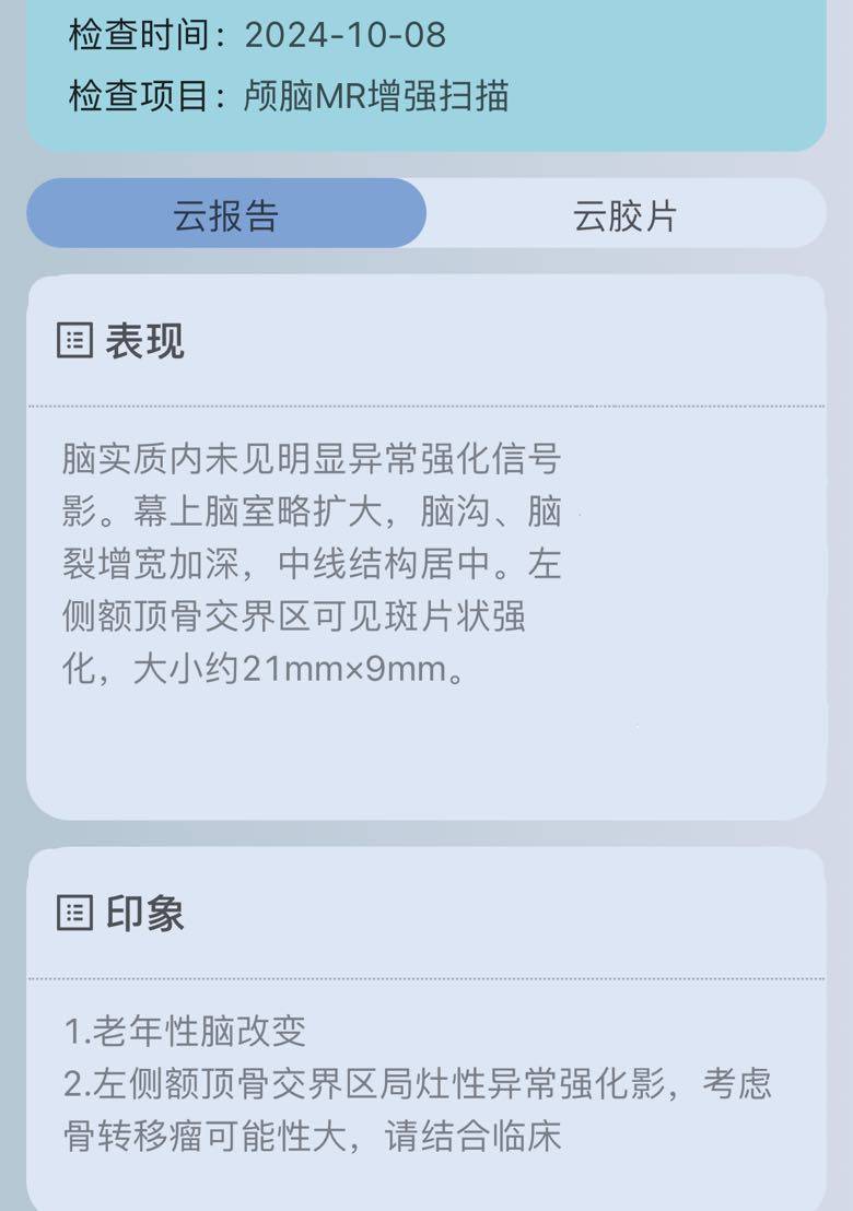 2024年9月复查,cea继续下降至0.71,历史最低。体感良好,肺部持续稳定,髋臼处这次提示继续缩小(之前大约一年没变化),但做脑核磁时提示左侧额顶骨交界区异常强化影,怀疑骨转移?上一次脑核磁是半年前,未提示异常。
