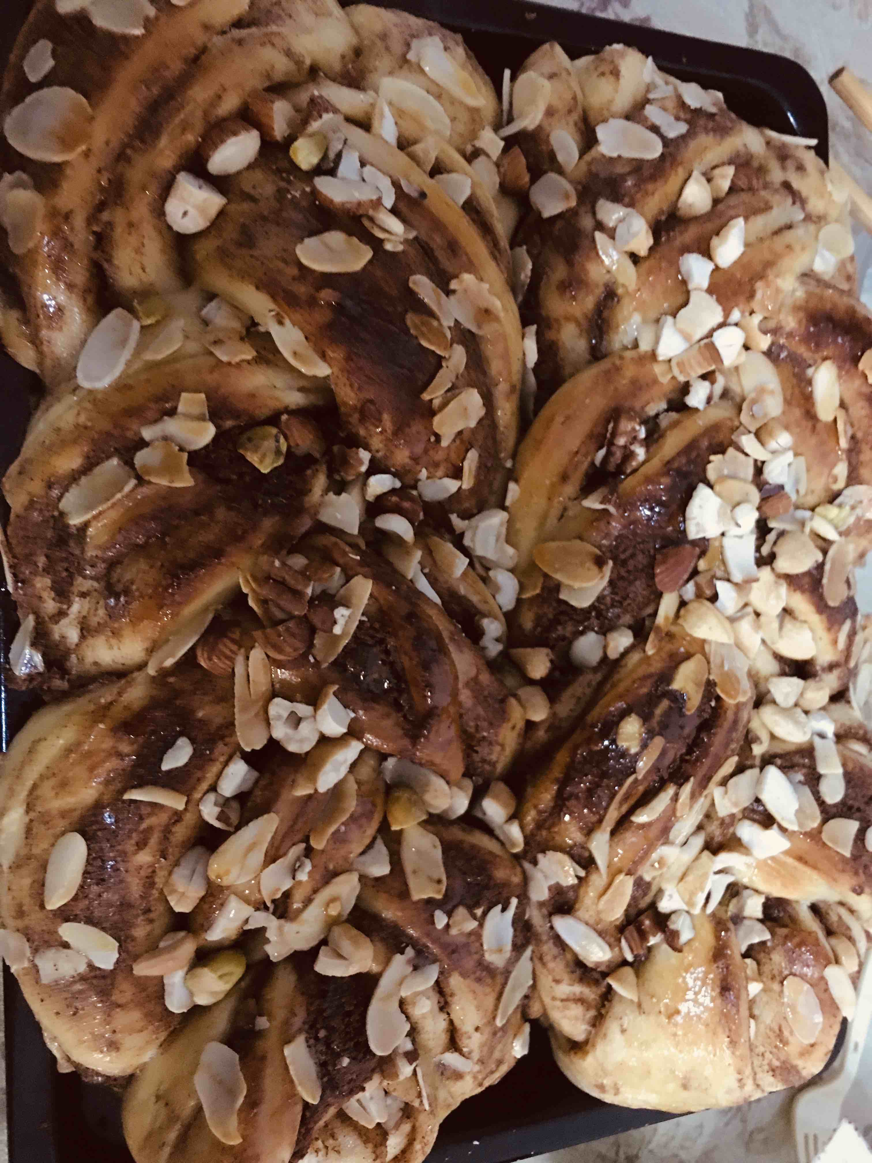 今天学做了一款肉桂面包,以前在美国吃过,味道不错,这次我特意买了肉桂粉带回来做面包,今天在网上搜索了配方,如果有巧克力酱味道会更好吃,但这个味道也不错,撒了些坚果碎我喜欢肉桂的香味,下次再放点巧克力或者巧克力酱。
