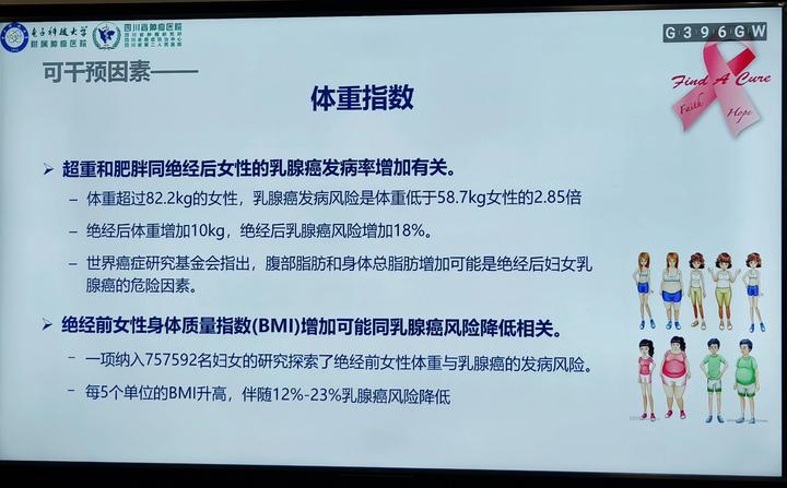 6、研究发现:绝经前胖点,乳腺癌风险较低;相反绝经后不能胖了,绝经后长胖相对患癌风险增高。但是也不等过胖,除了乳腺癌风险,还有其他疾病风险要注意控制体重。