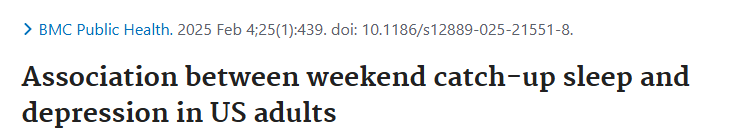 [2]Le L, Lan Z, Chen C. Association between weekend catch-up sleep and depression in US adults. BMC Public Health. 2025;25(1):439. Published 2025 Feb 4. doi:10.1186/s12889-025-21551-8