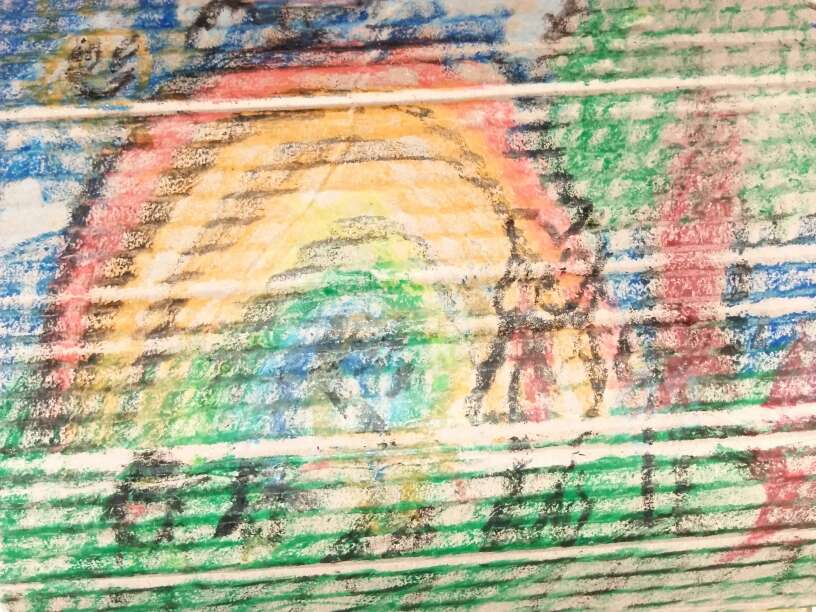 今天中午我洗衣服,他就端着小凳子来了说要洗脚其实就想玩水,我说那你去把风扇关了,他去了回来我问他关了吗没理我,我出来拿衣架的时候看是关着的,我洗好了他自己把小凳子端出来。前几天看了飞跃彩虹今天就在那画我问他画什么他说彩虹,画好了很高兴跳来跳去的看,我说给妈妈看他拿过来了,我一看我说画得真漂亮太棒了,他很高兴的看着我笑。下午出去转一圈回来了,我说宝贝该写字了,他说要吃苹果自己去拿了一个叫我削皮,吃了苹果自己就把字写啦真乖。