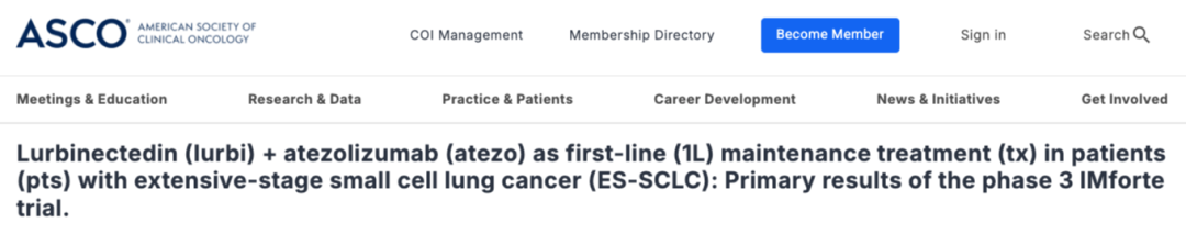5 月 23 日,ASCO 官网显示,芦比替定(lurbinectedin ) 联合阿替利珠单抗(atezolizumab) 作为广泛期小细胞肺癌 (ES-SCLC) 患者一线维持治疗的 III 期 IMforte 研究(NCT05091567)结果摘要已公布。这是首个在 ES-SCLC 患者一线维持治疗中显著改善 PFS 和 OS 的全球 III 期研究。