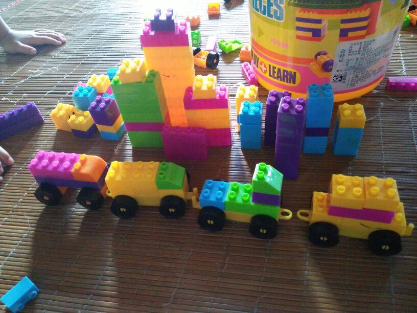 今天我洗碗的时候他玩积木,我洗好一看他弄了一排车子在放那儿,我说这是什么车他没理我,我说是火车吗他马上说是小汽车,我说是小汽车呀宝贝做得很好哟还帮它们把队都排好了,我问他车子后面是什么他说房子我说哇这么多房子真漂亮,他很高兴跳来跳去的看,发现他想象力真丰富。