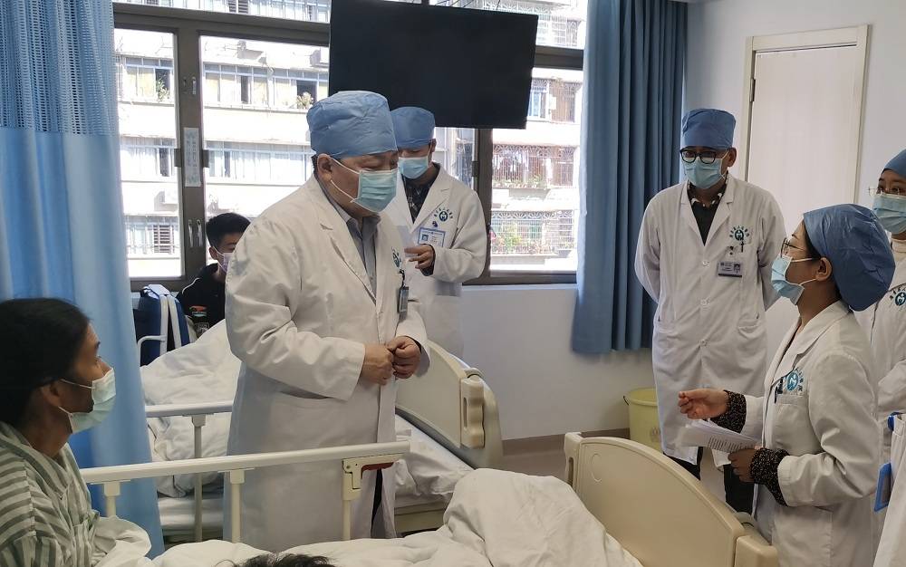 吴一龙教授(中)在与其他医生商讨病人的治疗情况和进展。