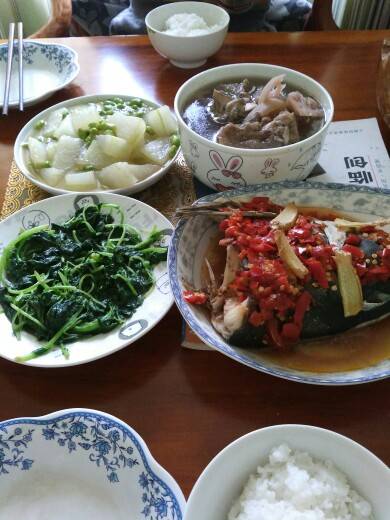 丰盛,看着就知道色香味晚俱全,晚饭吃的挺早的。