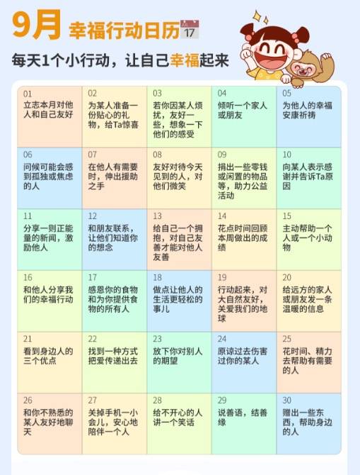 今天看到一个九月幸福行动日历,很喜欢,我们一起来打卡,寻找幸福吧。