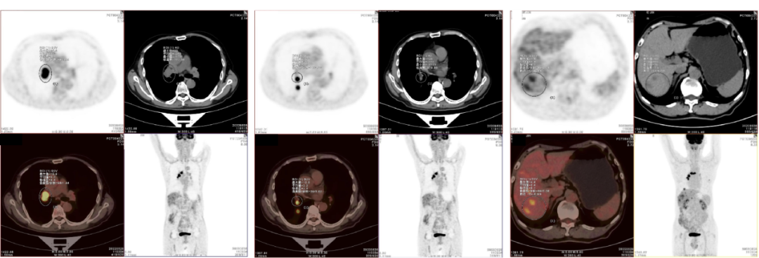 2022-5-28  PET-CT:1.右肺下叶背段支气管腔内一软组织结节,FDG代谢异常增高;右肺下叶背段胸膜下一略不规则结节影,FDG代谢轻度增高;纵隔气管前腔静脉后、主肺动脉窗、右肺门及右肺内支气管旁可见多发肿大淋巴结,FDG代谢异常增高;肝脏实质内多发稍低密度结节影,较大直径约1.5cm,FDG代谢增高;考虑右肺下叶背段肺癌伴右肺内、淋巴结及肝多发转移,小细胞肺癌可能大。2.两肺多发微小结节影,FDG代谢未见增高,考虑性结节可能大,部分合并转移不除外。3.两肺慢性炎症伴肺气肿,少许肺大泡形成,两侧部分胸膜增厚、粘连。