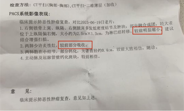 最近的复查在半个月前,医生告诉我们,妻子已达到部分缓解(PR)”状态,影像上的肿瘤已变得非常小,几乎看不见。