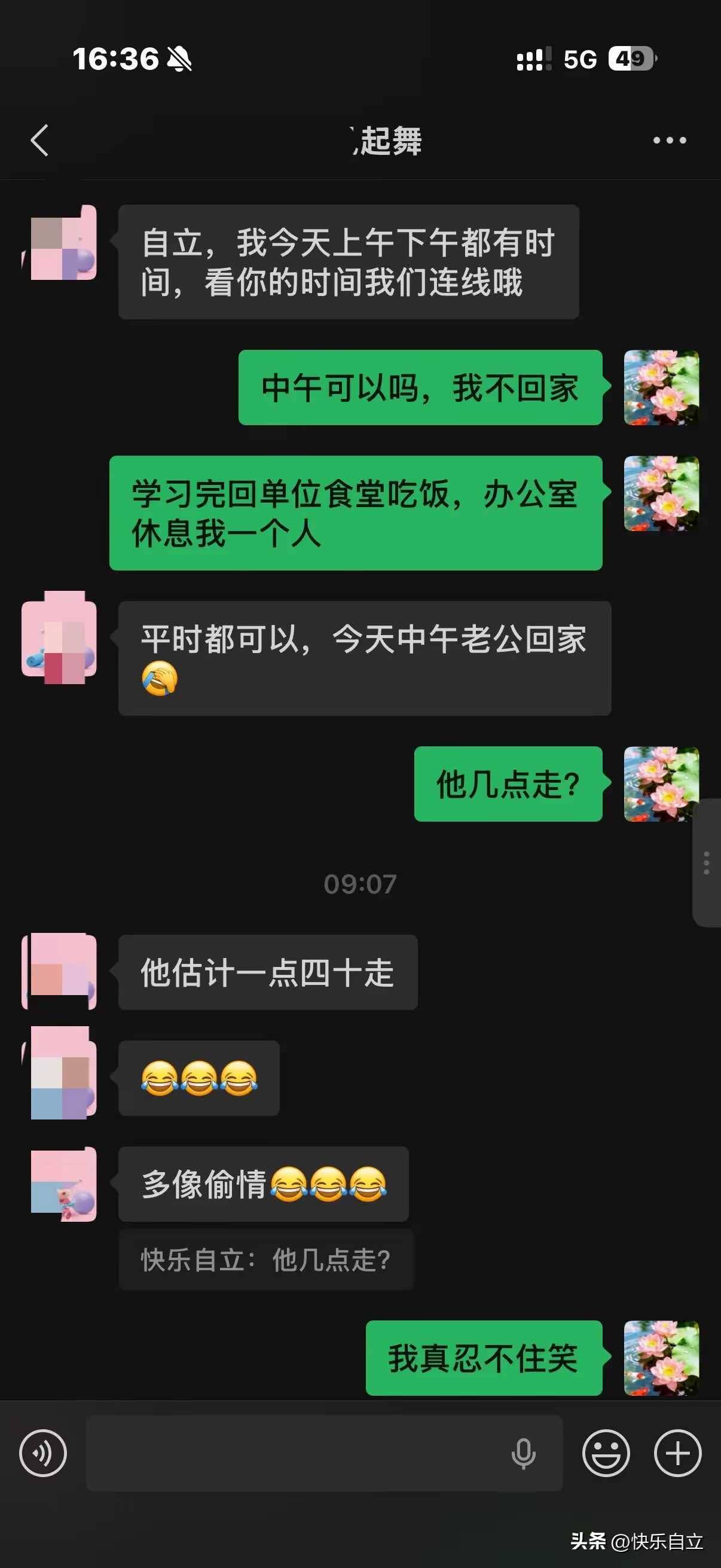 我们的聊天时间要选择我们俩都有空,避开老公在家的时间,昨天我们就说偷感很重,今天我俩的问法更像偷情一样。约个时间也把我笑死,太开心了。一周的时间太短暂,马上就要结束了。