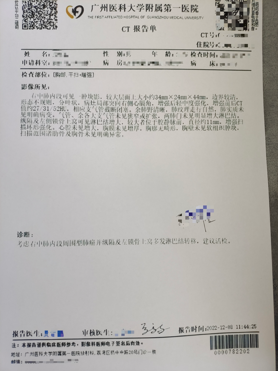 我没有拖,当天就去了当地医院,但看完结果总觉得不踏实,连夜赶去广州医科大学附属医院做全套检查。CT、穿刺……一项一项排下来,等待结果的每一个小时都格外漫长,心也随着每一份报告越沉越重。