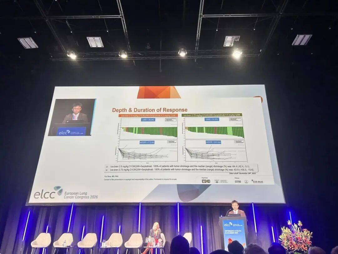2026 年欧洲肺癌大会(ELCC)上,国际肺癌研究协会(IASLC)主席、上海东方医院周彩存教授团队的周斐教授代表研究团队进行大会口头报告,最新研究带来重磅突破 ——全球首创双抗ADC药物,iza-bren联合 PD-1 单抗,在初治广泛期小细胞肺癌一线治疗中交出突破性疗效数据,为患者实现高水平长生存开启了全新可能。