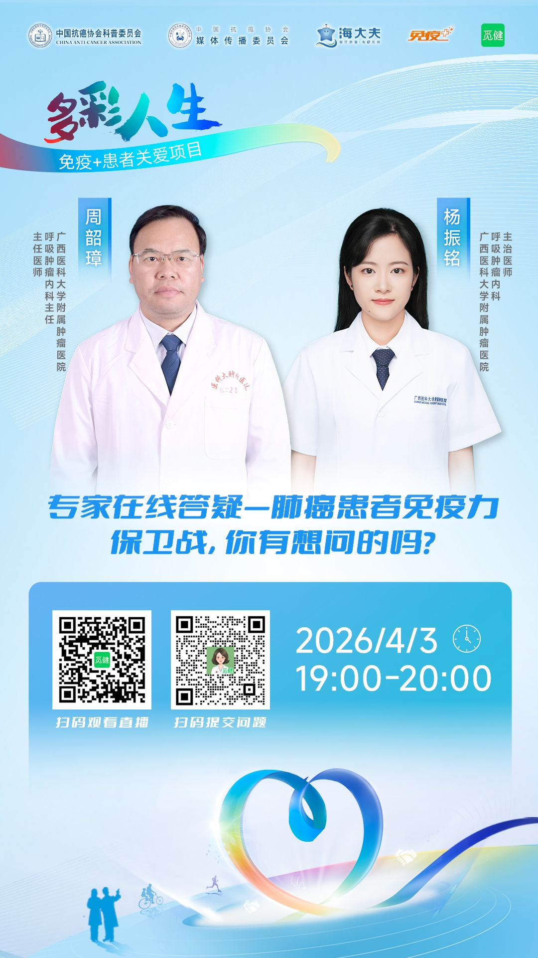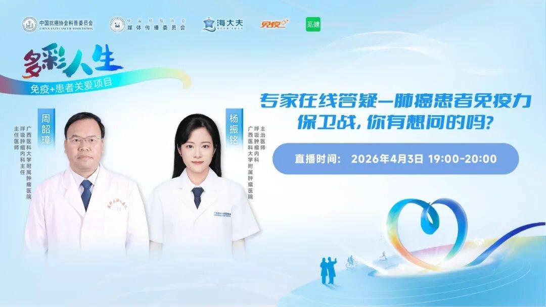 4月3日19:00-20:00,「多彩人生・免疫+患者关爱项目」特邀广西医科大学附属肿瘤医院呼吸肿瘤内科周韶璋主任、杨振铭医生,开启肺癌患者免疫力“保卫战”专家在线答疑专场。