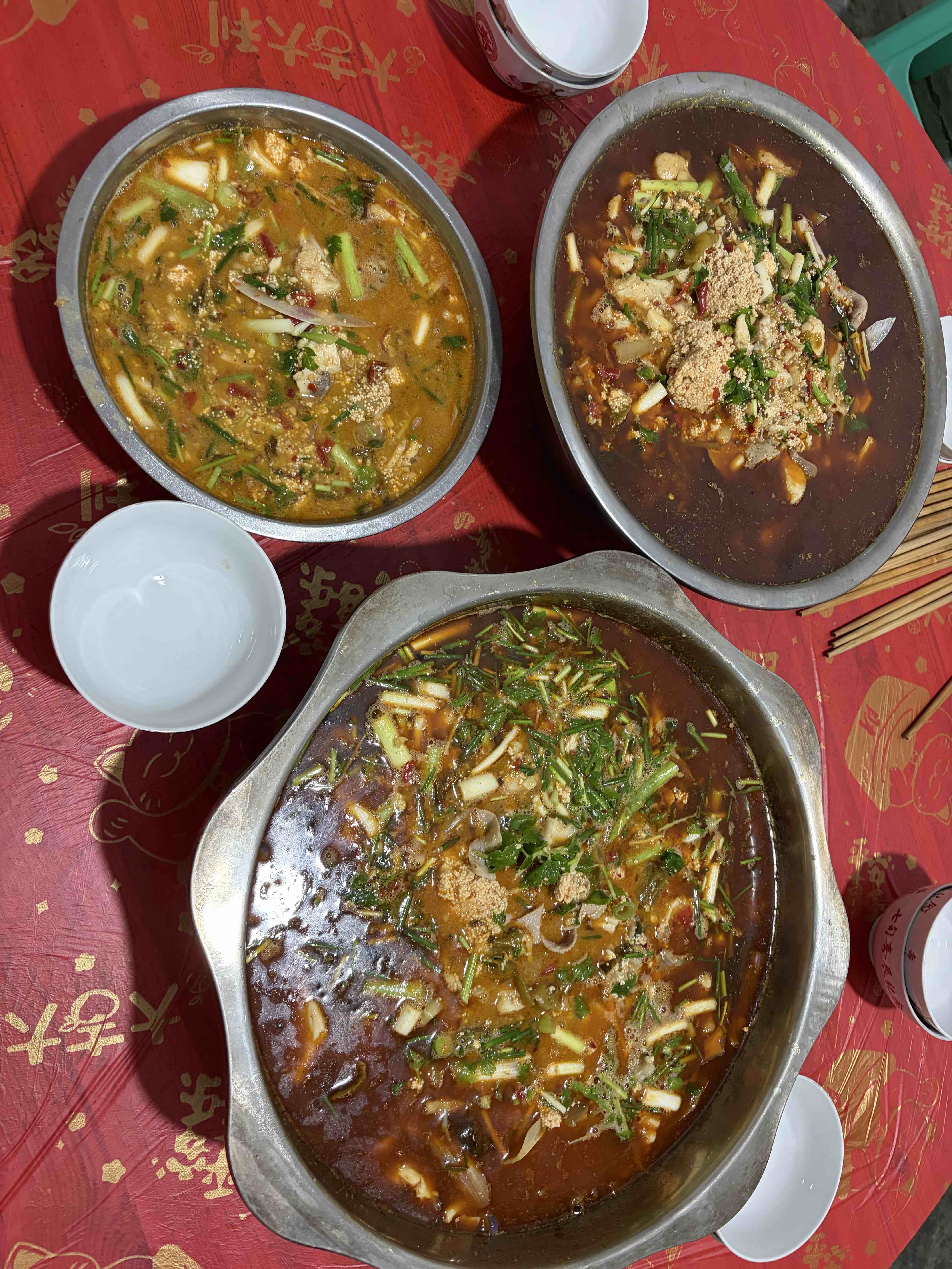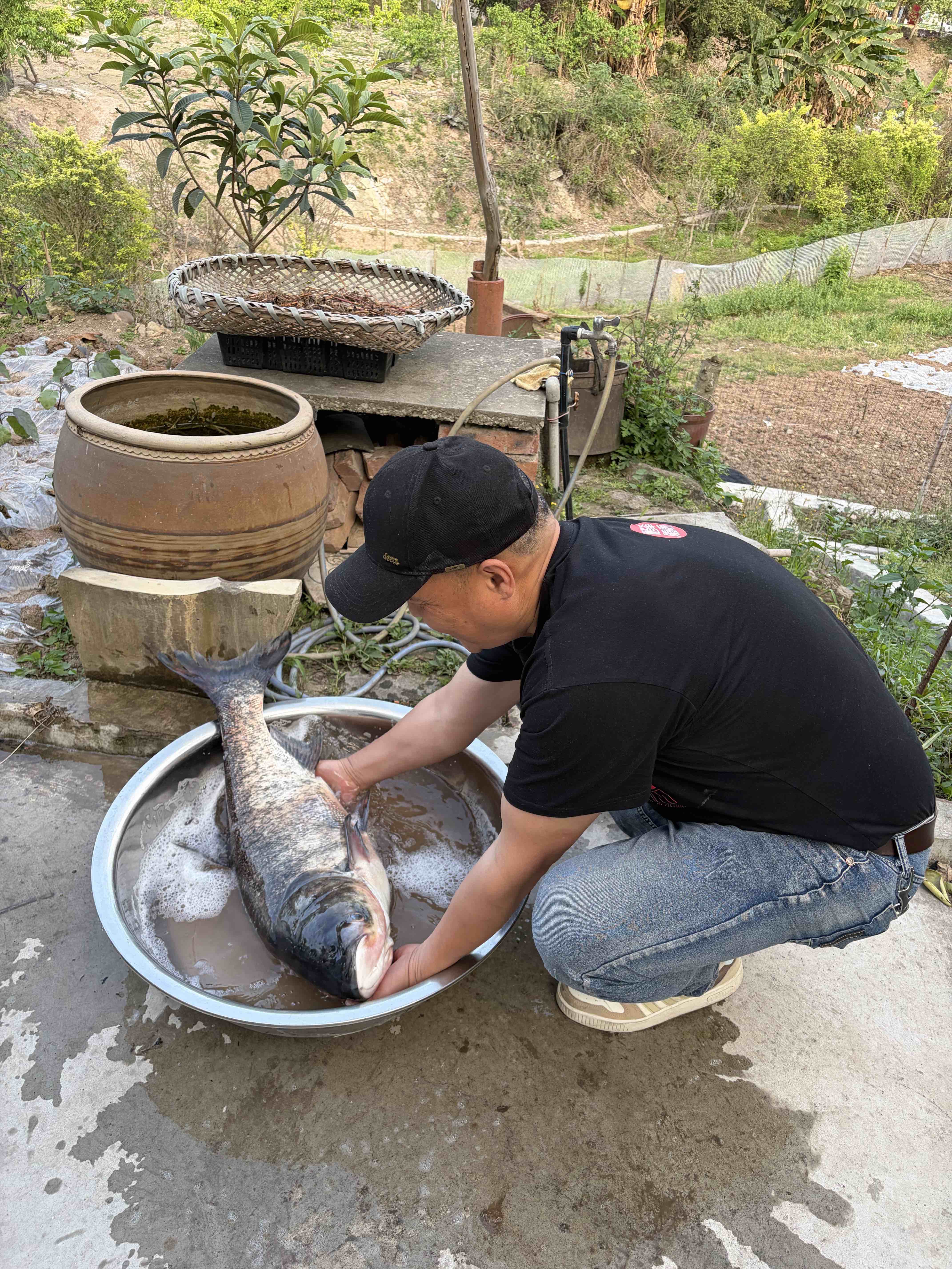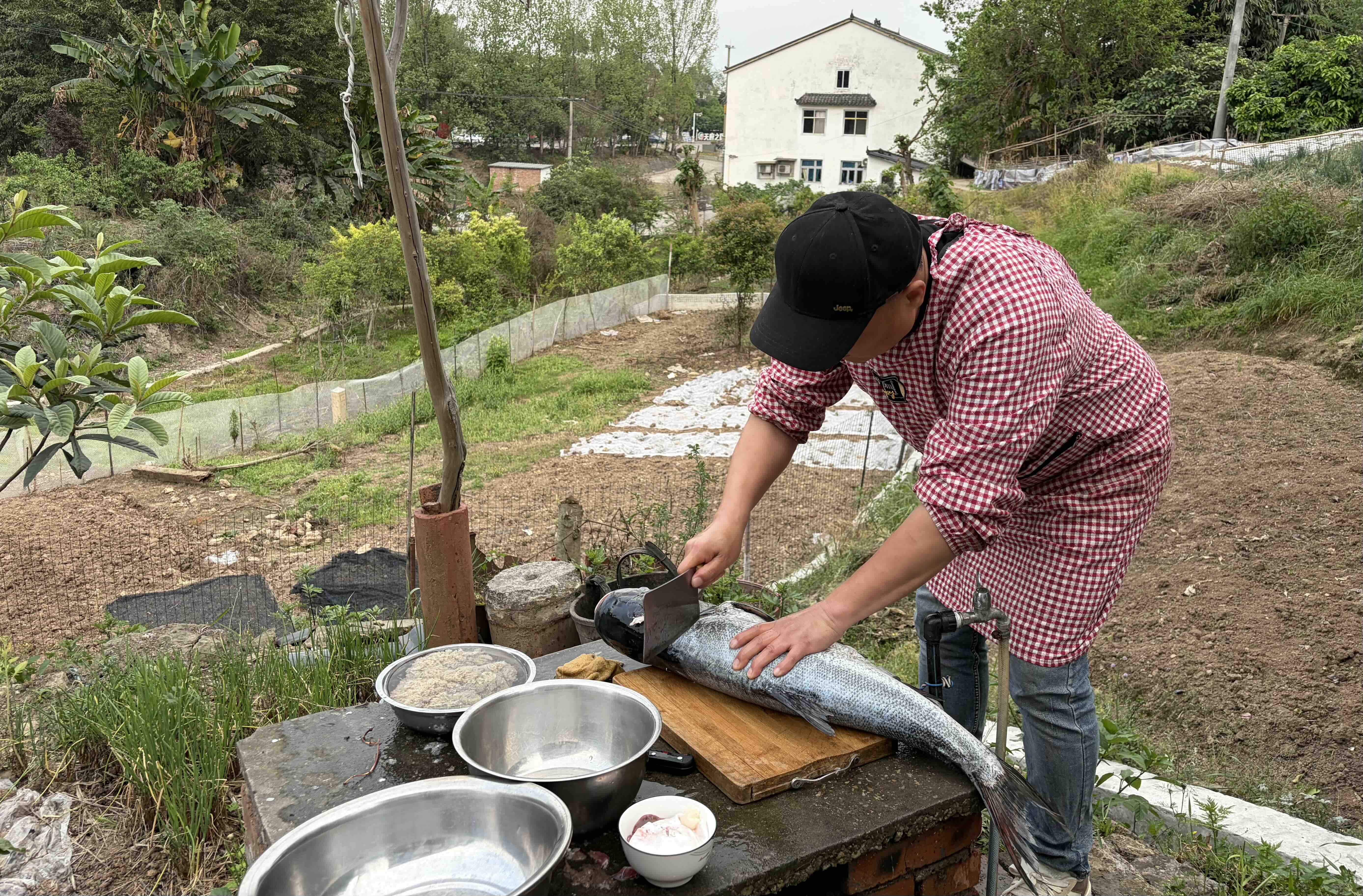 今天老公的朋友去雅安,弄了一条水库里超级大的17斤半的花鲢鱼回来,叫我老公找地方加工来吃。找到另一个朋友的亲家的家,在高速路口附近,有个大场坝,方便打整。我老公穿上我们四川省省服,开始杀鱼。我真没看到过如此大的鱼,下锅前的前期工作有得好做,都弄得腰酸背痛。