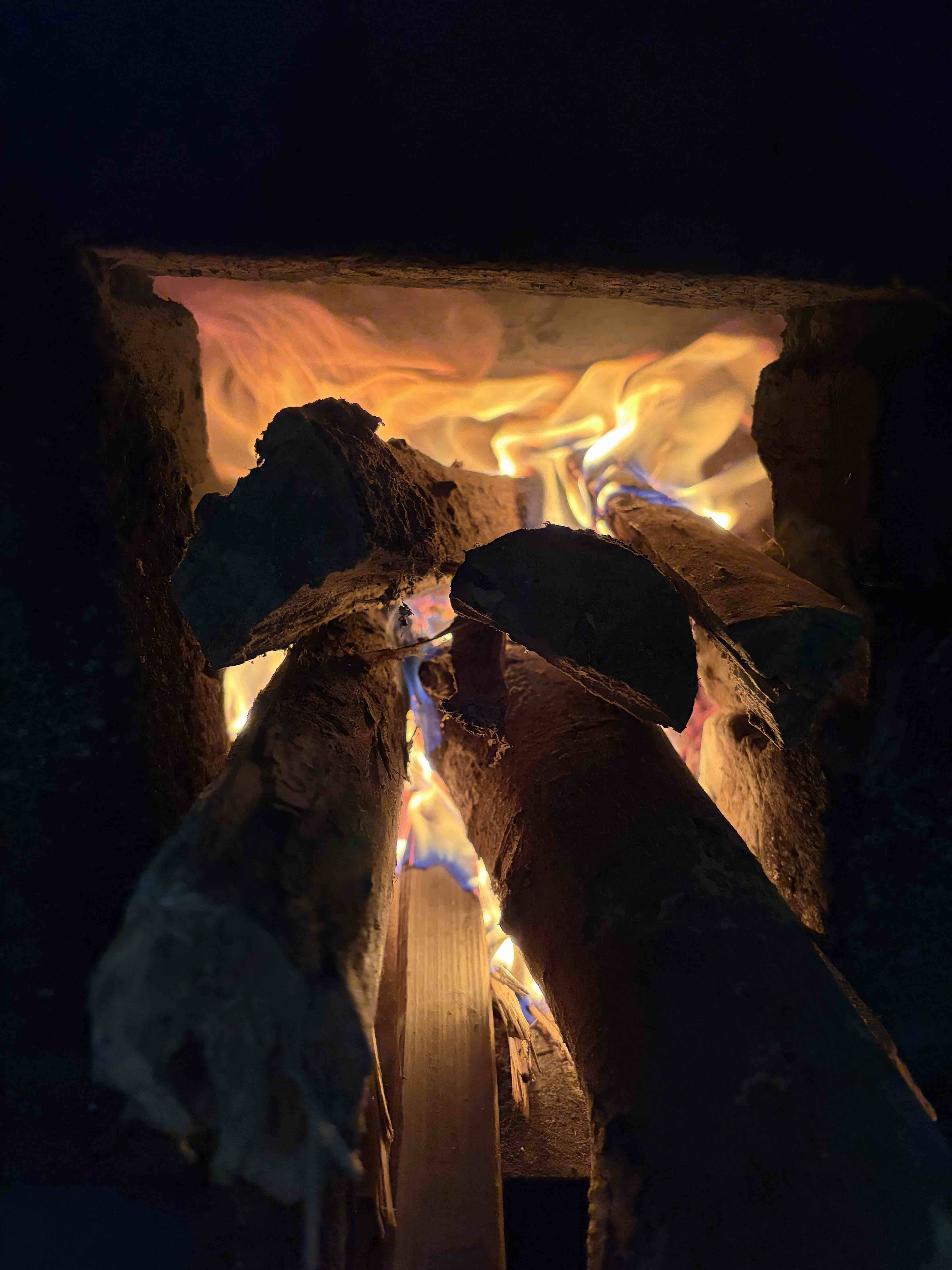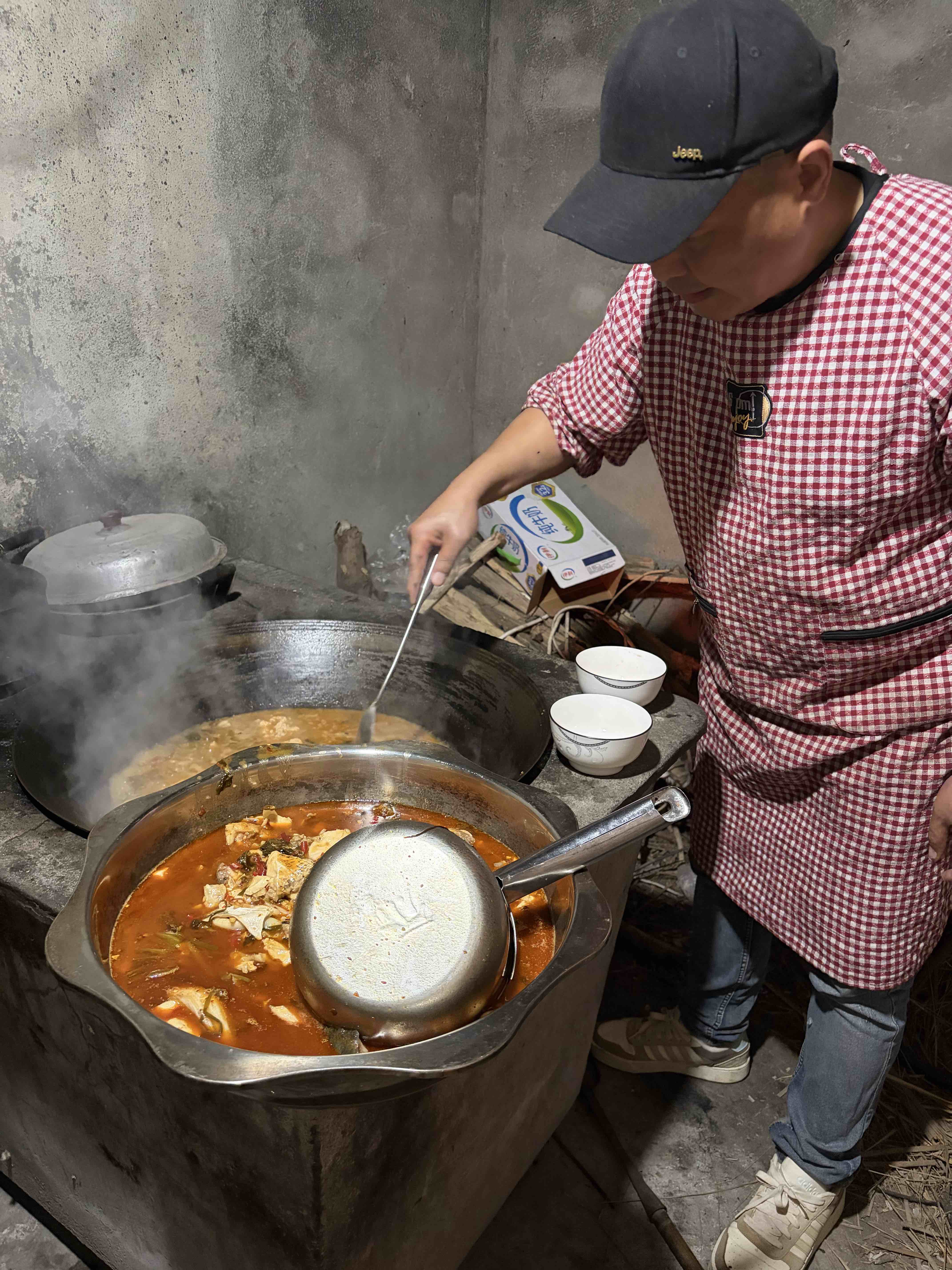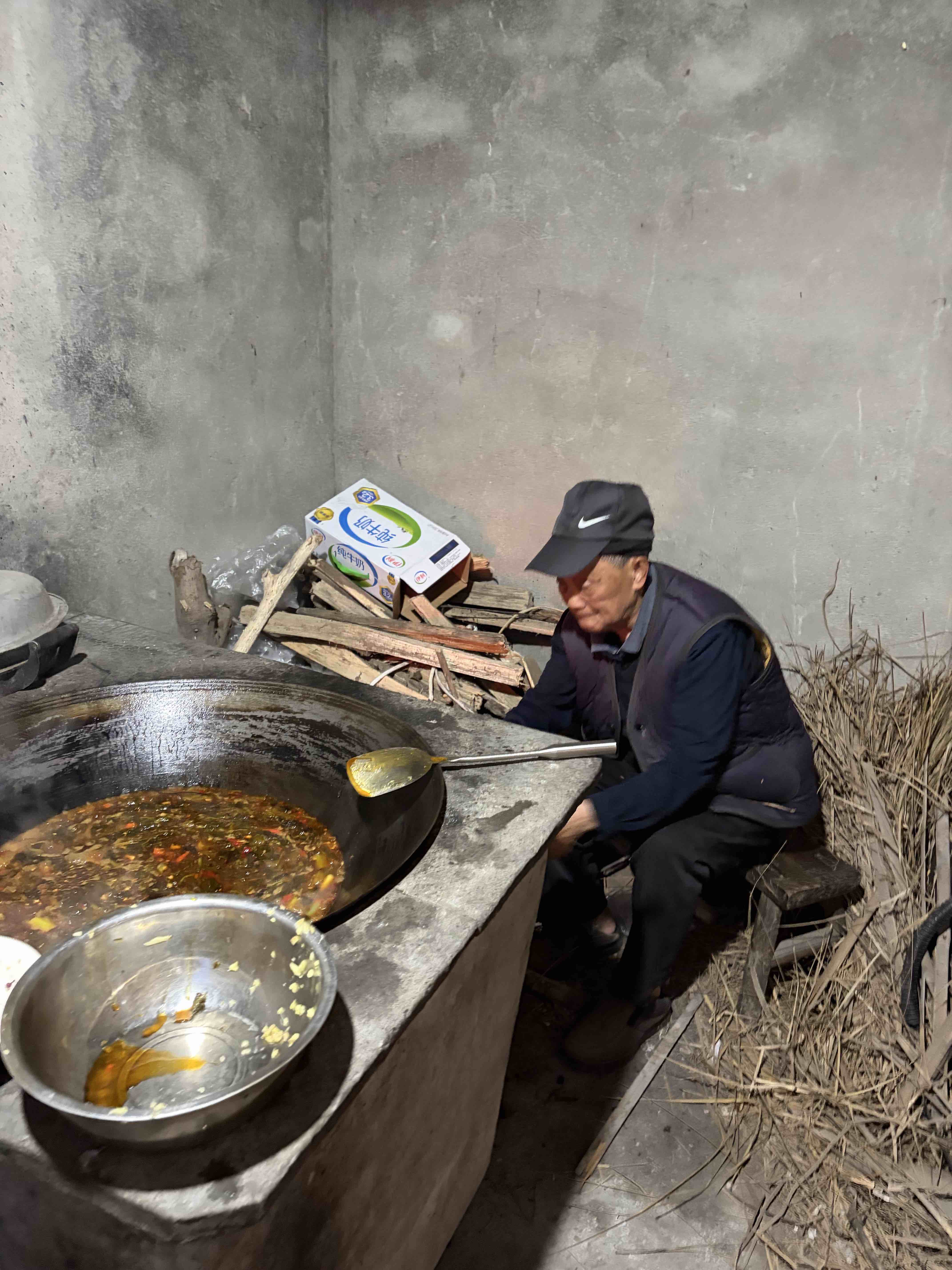 天然气灶完全煮不下,主人家89岁的爷爷亲自给我们升柴火灶,他把柴火烧得旺旺得,因为油烟太重,我让他离开厨房,我去负责添柴。看着火红燃烧的柴,生活真如这柴火一样红红火火,我们把日子过得热气腾腾。