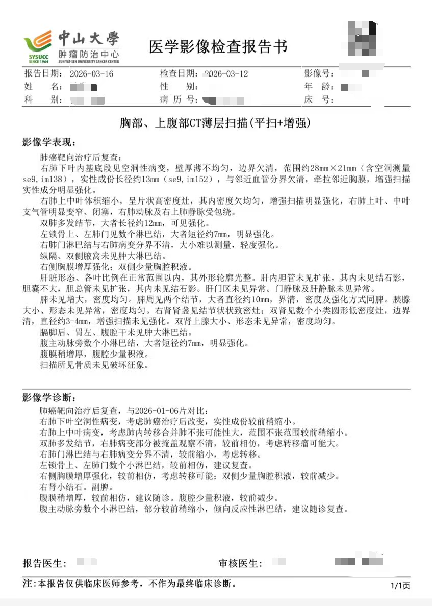 2025年复查时,我被查出肺部出现轻微肺不张。为了抓住最佳治疗时机、争取更好的预后,在和主治医生充分沟通、权衡利弊后,最终确定了靶向联合放疗的治疗方案。