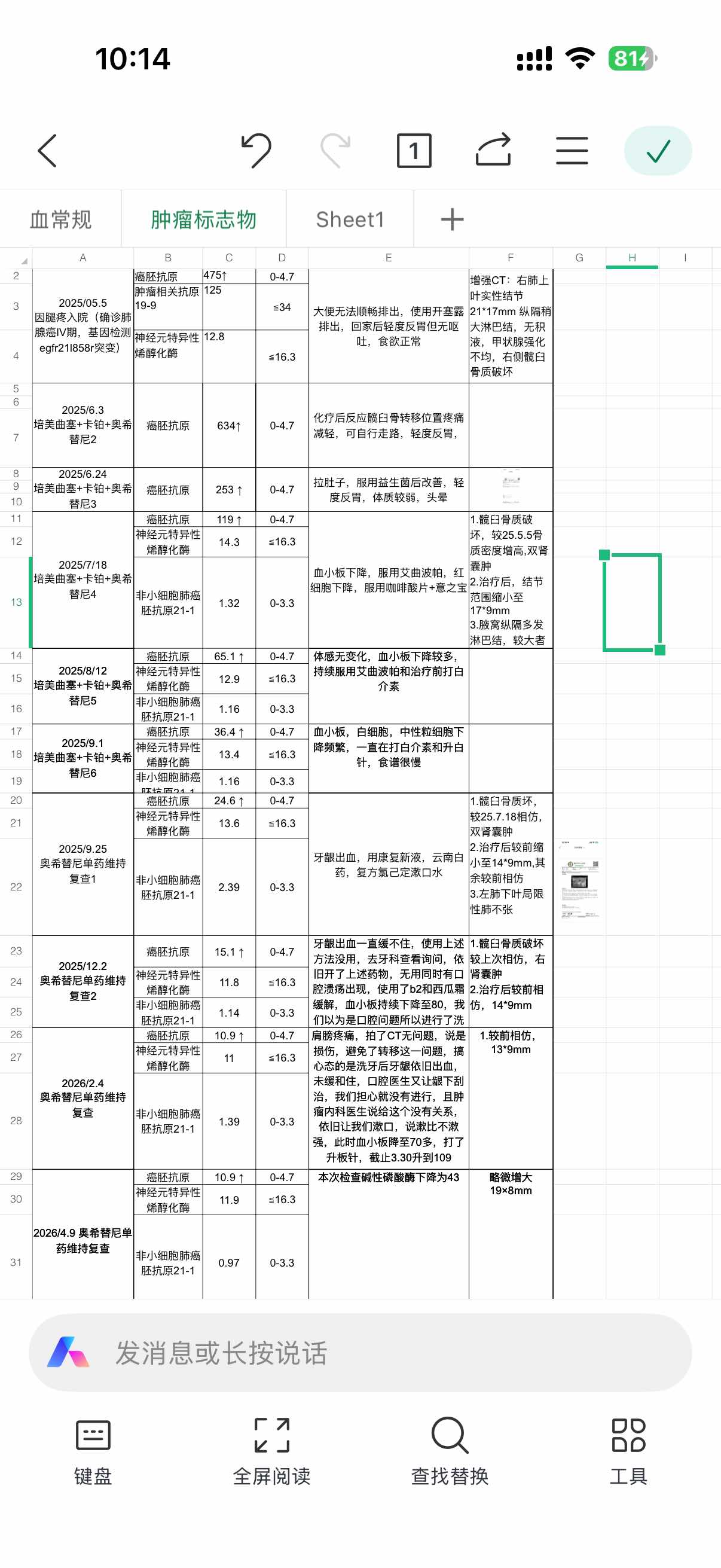 我母亲去年5月份查出的肺腺癌晚期骨转,EGFR21L858r,确诊初期做了6次培美曲塞+卡铂的化疗,后续一直单奥希靶向+地舒单抗维持,后续每2个月复查一次,CEA都在持续下降,截止2月份CEA 下降至10.9,肺部肿瘤是13*9mm ,今天复查发现肺部肿瘤增大为19*8mm,CEA没有下降,维持在10.9,这是不是缓慢耐药的迹象,我同步也问了下AI,都回复的是20% 以上增长是进展,这13-19环比都增长了40多了,大概率是缓慢进展了,其他部位没有发现转移,接下来的行动怎么做