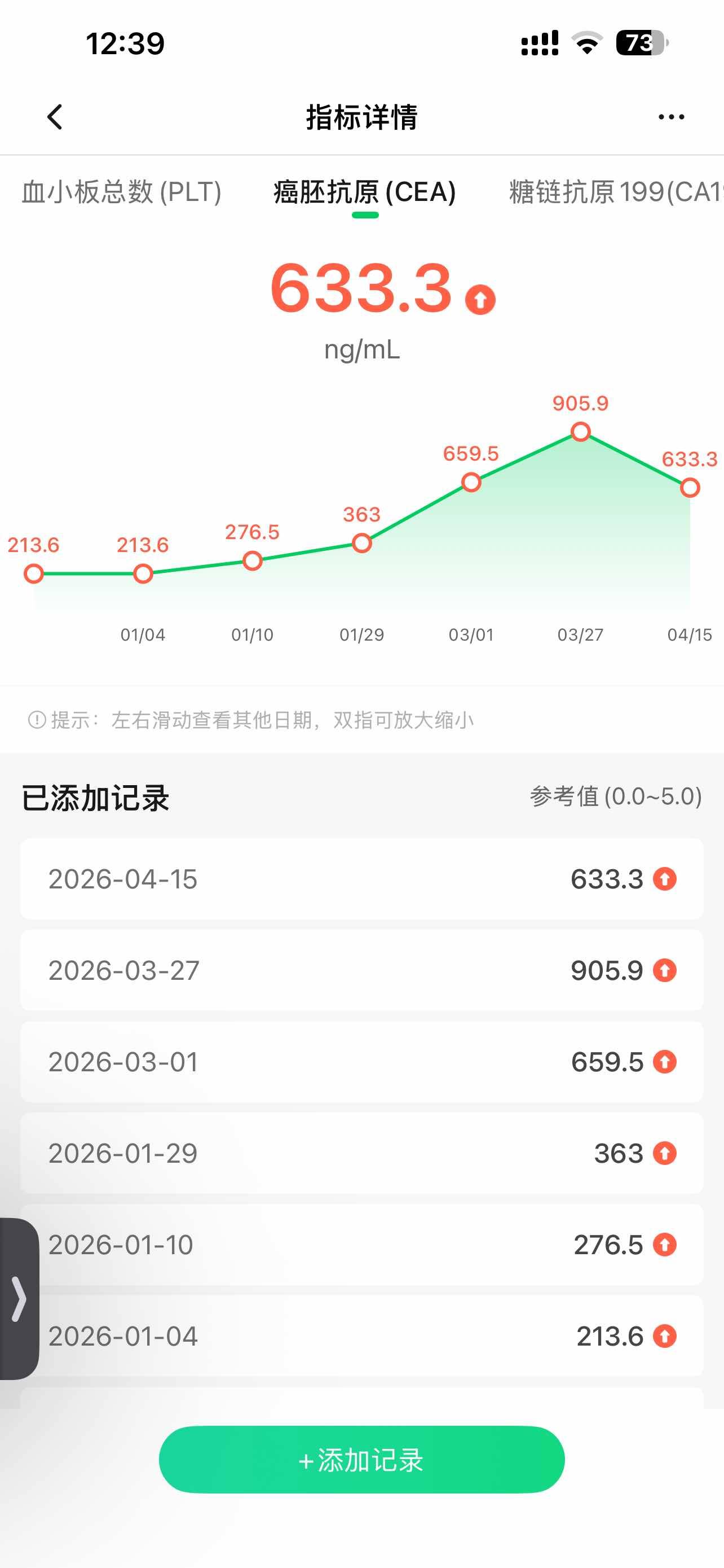 换线8201后第一次复查敏感肿标,最明确的CEA从905下降到633,几个月来第一次降低。