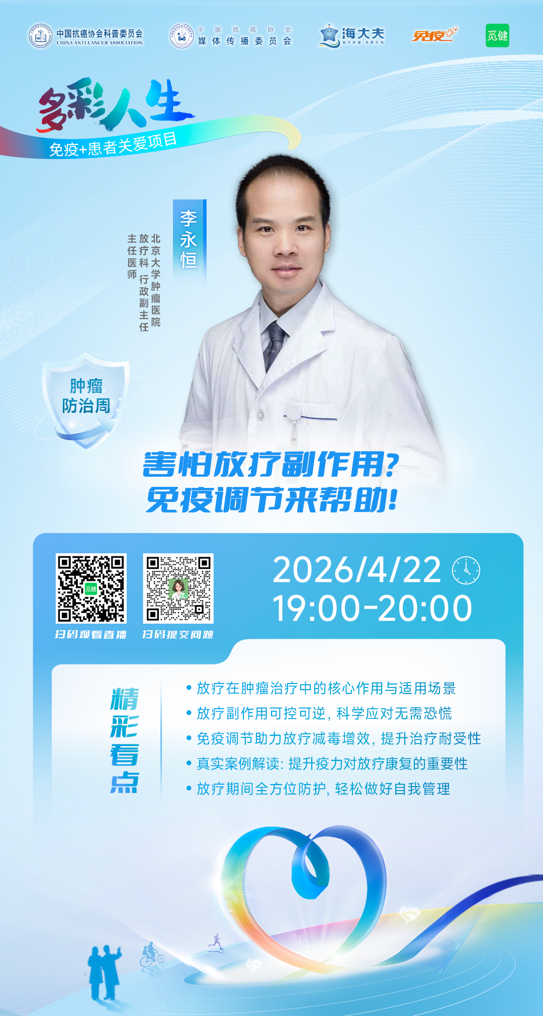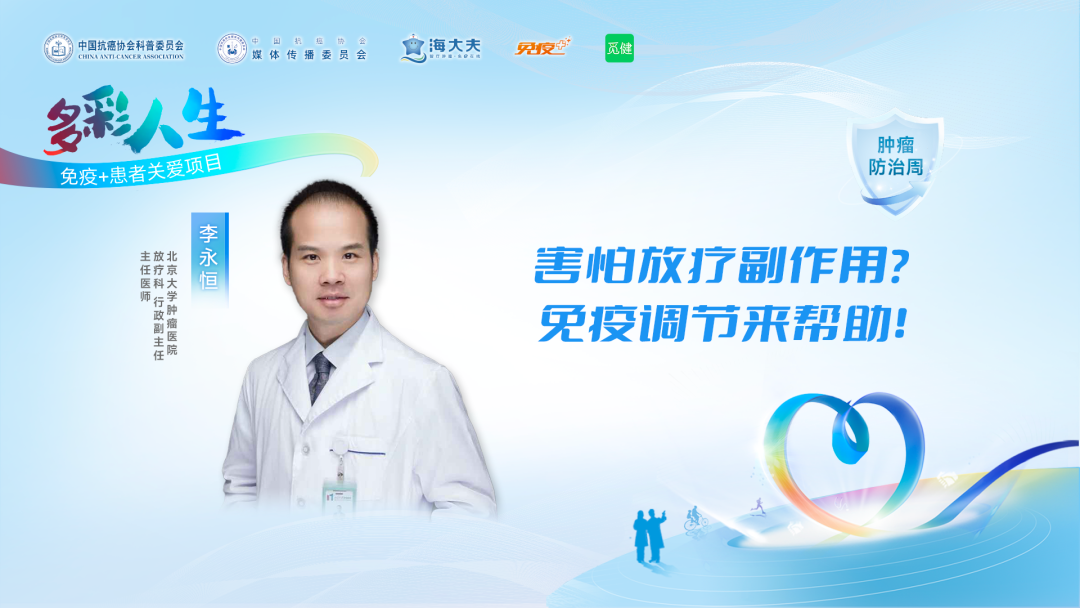 值此肿瘤防治宣传周期间,“多彩人生,免疫+”患者关爱项目特邀北京大学肿瘤医院放疗科李永恒教授倾情开讲,聚焦大家最关心的放疗安全、副作用管理、免疫保护三大核心内容,用权威临床经验为患者答疑解惑,帮大家放下焦虑、安心放疗。
