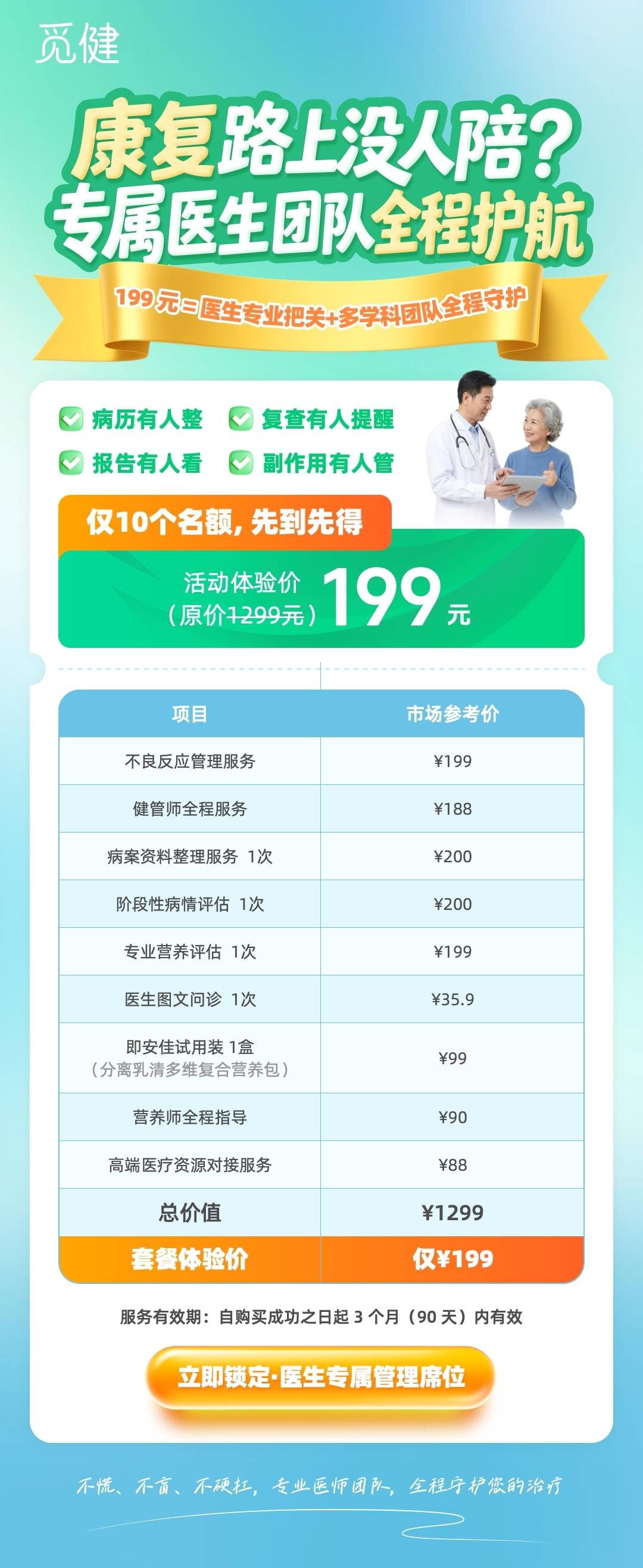 觅健为你打造专属医生团队全程护航服务,原价 1299 元的全套管理服务,现在体验价仅需199 元!