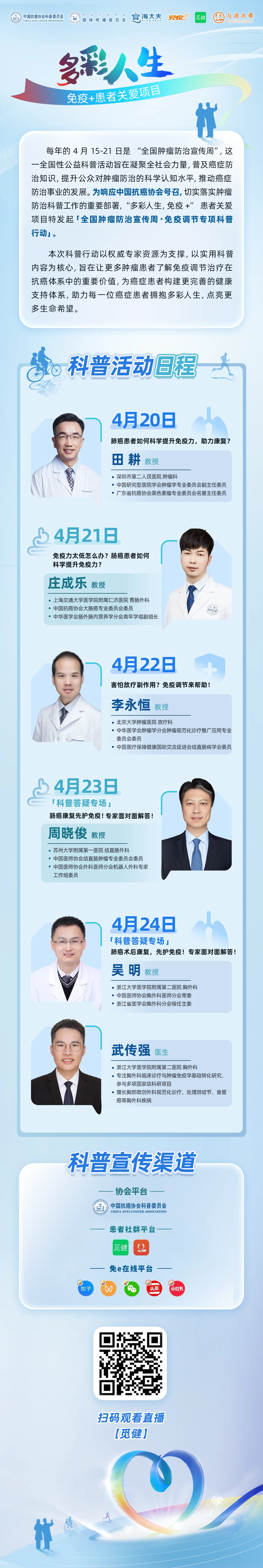 今年肿瘤防治周期间,项目特邀6位专家于4月20日-4月24日期间连续开展线上直播科普+患者答疑活动,并借助线上媒体以及数字化患者服务平台进行科普传播,助力患者实现更好的健康管理和生活质量。