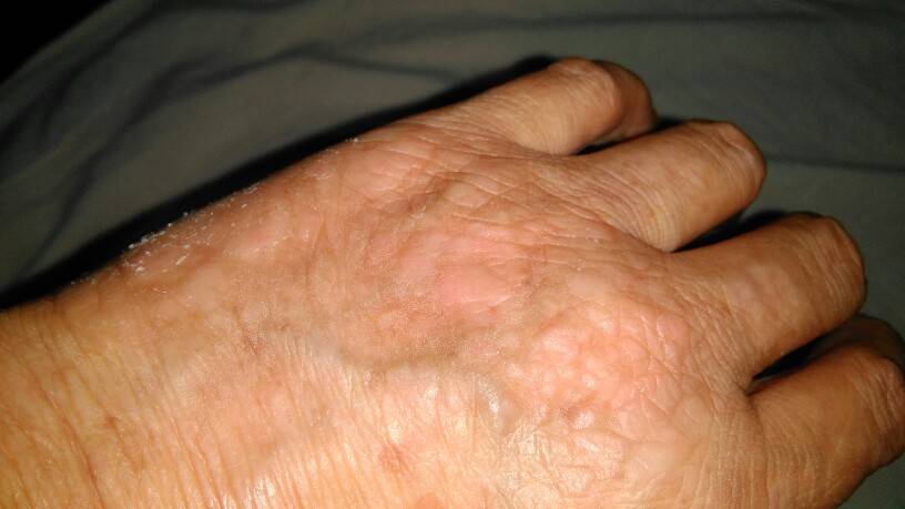 我是在手上,痒痒的,还裂口,不能碰水,碰水就痛。医生说的和你说的一样。免疫力低。我到皮肤科会诊给的药你看看。不知你?我的手好了。