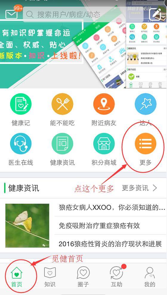 步骤1:打开觅健app首页,点红色圈子里的更多