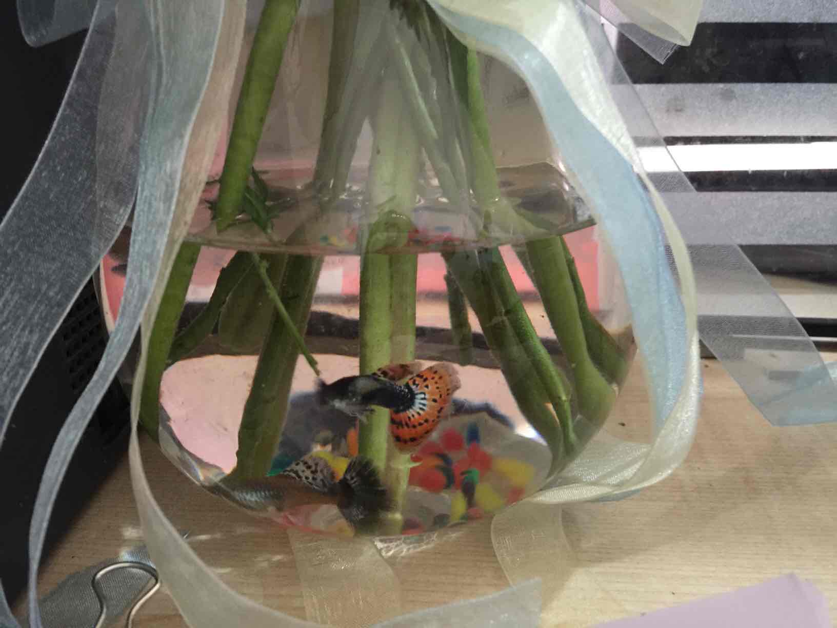 花了35,买了鲜花,绿叶,四条孔雀,两公两母,母的都是怀孕的鱼~一个渔网,一袋孔雀饲料。