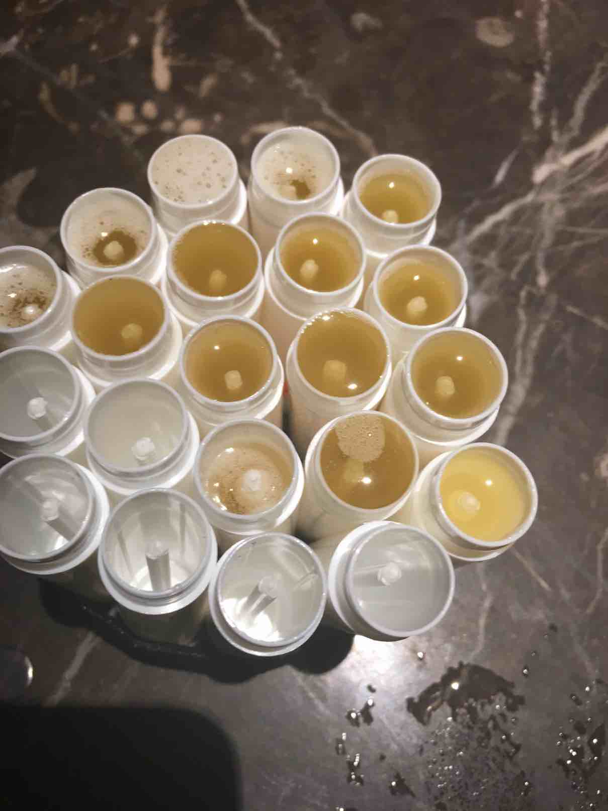 3.将唇膏盒(淘宝上有卖)直立在桌上,烧杯稍微倾斜,满满将融化的液体注入盒内,很快就凝固了,盖好盖子,成功!