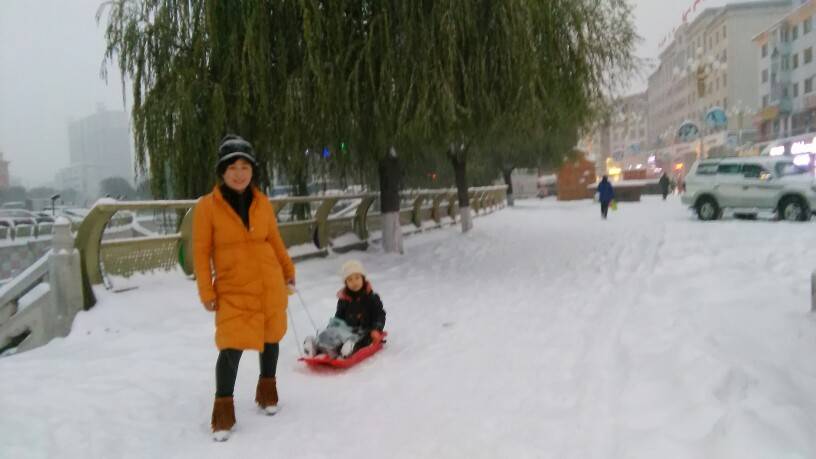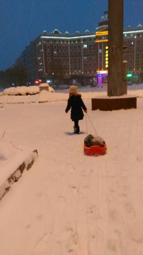 这么大的雪真美,宝贝肯定喜欢坐着爬犁回家,省力又好玩儿。