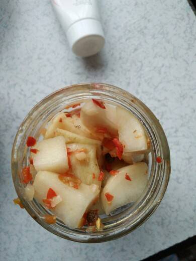 我以前做过韩式的萝卜泡菜,那个是发酵的,我没经验,把它放到密封的玻璃瓶里,结果发酵的时候把瓶子弄裂了