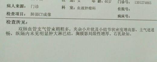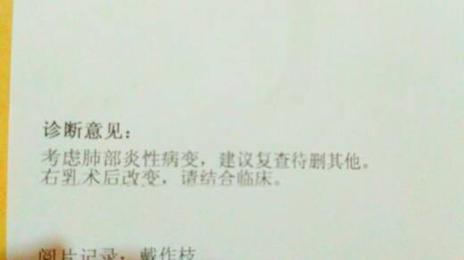 姐妹们大家中午好!今天刚到医院拿结果回来,拿到结果的那一刹那,还是忍不住眼泪直流,看到医生后已经说不出话来,医生看了结果后说不要紧,左乳只是小纤维瘤,肺部炎性病变是放疗引起的,开刀处积液会慢慢消的。等三个月在复查对比一下,感谢医生!虚惊一场,上帝保佑一切平安
