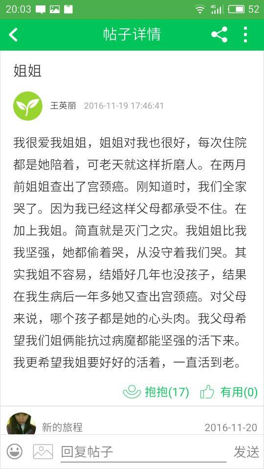 我很爱我姐姐,姐姐对我也很好,每次住院都是她陪着,可老天就这样折磨人。在两月前姐姐查出了宫颈癌。刚知道时,我们全家哭了。因为我已经这样父母都承受不住。在加上我姐。简直就是灭门之灾。我姐姐比我我坚强,她都偷着哭,从没守着我们哭。其实我姐不容易,结婚好几年也没孩子,结果在我生病后一年多她又查出宫颈癌。对父母来说,哪个孩子都是她的心头肉。我父母希望我们姐俩能抗过病魔都能坚强的活下来。我更希望我姐要好好的活着,一直活到老。