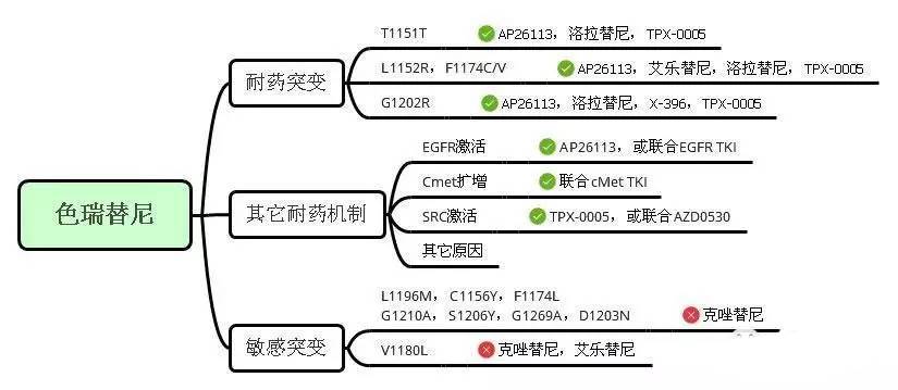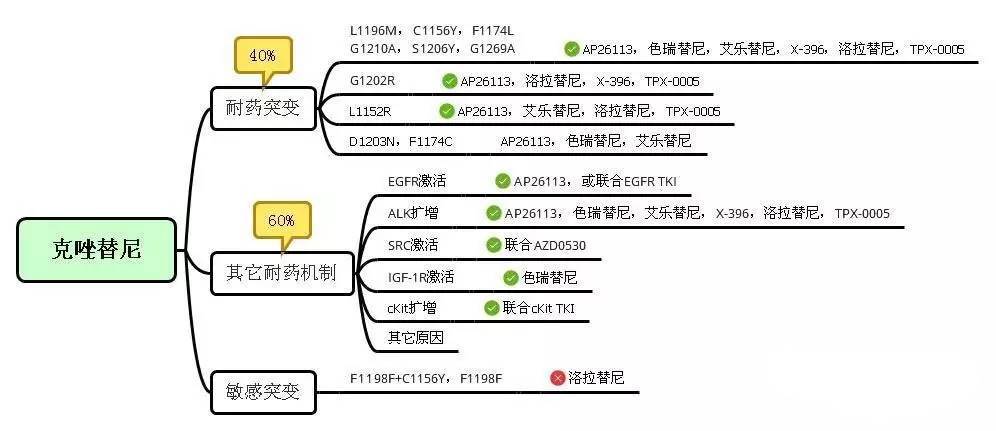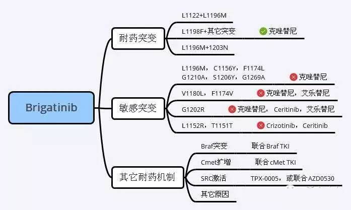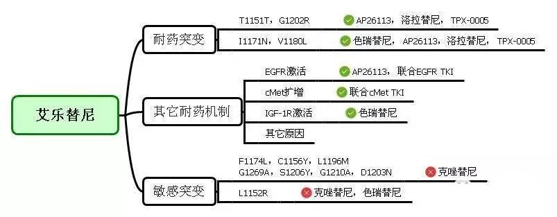 克唑替尼等ALK抑制剂与其他靶向药物相似,虽然最初疗效显著,但最终肿瘤会产生耐药。EML4-ALK融合基因不仅有多种变体,而且EML4-ALK激酶结构域各个点位都可能发生继发突变。ALK抑制剂的二次突变耐药机制与Bcr-Abl抑制剂类似,具有耐药突变的多样性,包括L1196M和V1180L看门人突变、C1156Y、G1202R、S1206Y、F1174L、G1269A突变和插入突变1151Tins等,以及C1156Y L1198F等双突变。不同的ALK抑制剂的敏感和耐药突变均有区别。同时,ALK抑制剂的其他耐药机制包括其他激酶(c-KIT、IGF-1R、KRas和EGFR)异常活化和cMet扩增等。